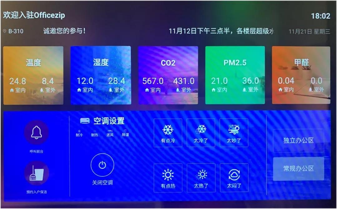 透過自主控制熱舒適參數(shù)的智能化模塊,確保所有建筑用戶獲得最大程度的熱舒適。提供直觀的用戶界面,點(diǎn)擊“有點(diǎn)冷”、“太冷了”、“有點(diǎn)熱”、“太熱了”來控制在室內(nèi)溫度;點(diǎn)擊“太吵了”,空調(diào)風(fēng)速會(huì)降低;監(jiān)控面板右側(cè)的“獨(dú)立辦公區(qū)”與“常規(guī)辦公區(qū)”按鈕可用來分別控制個(gè)別空間的空調(diào)。