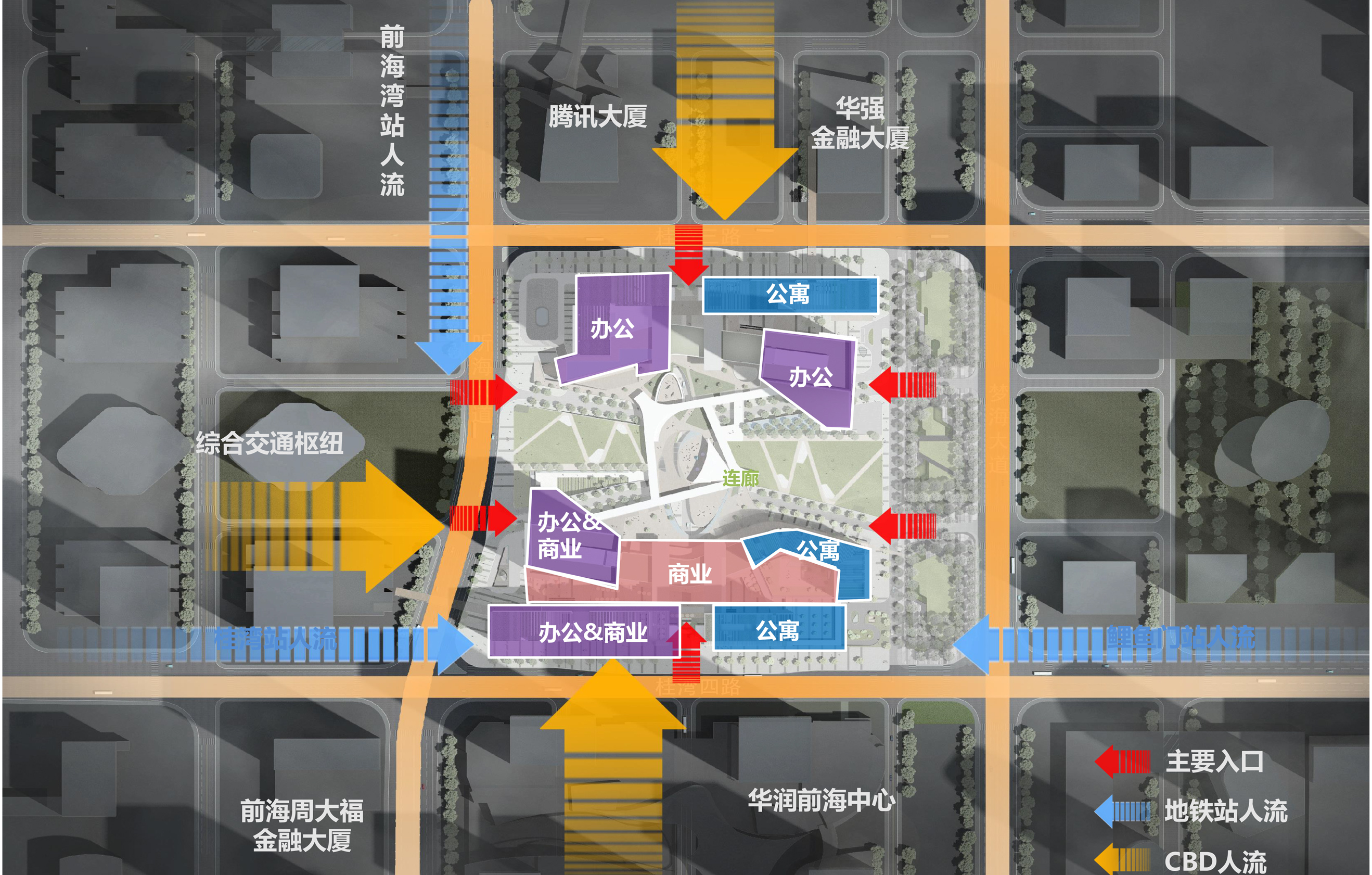 建筑設計以“微型城市”設計理念,圍合為個性卓越、整體協調的建筑形態,結合前海整體地下空間規劃,創造立體復合、生機勃勃的地下空間網絡,建立高效立體的交通系統,綠色、智能的低碳生態街區,塑造創新多元功能復合的金融產業街區。
