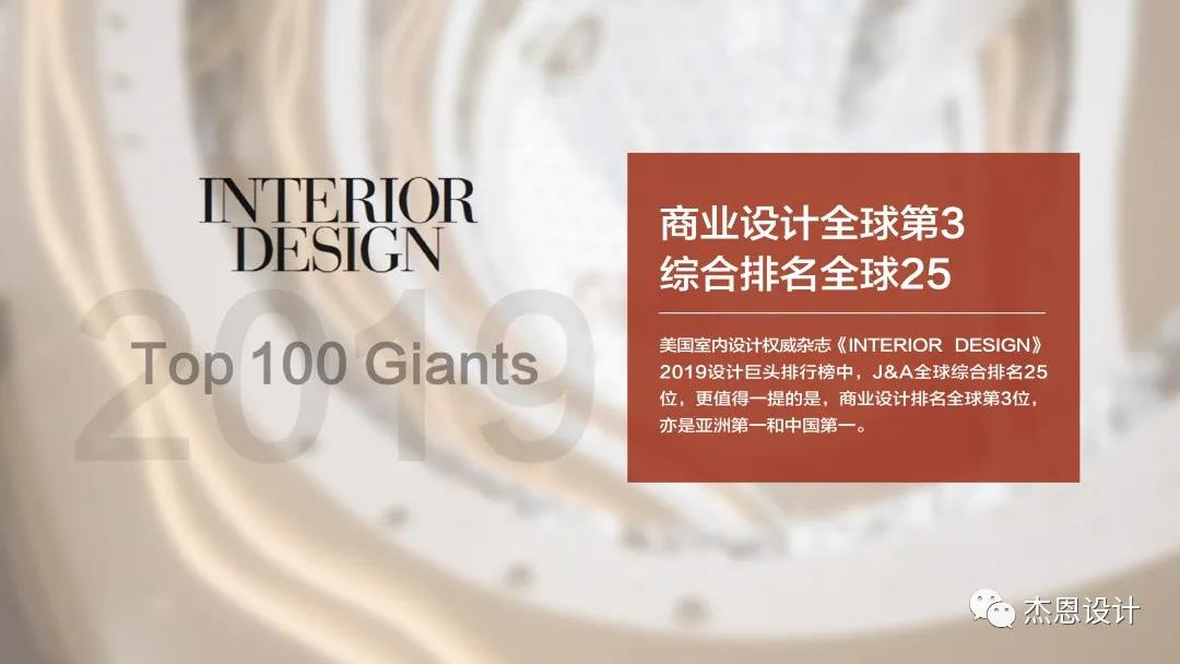 2017年,J&A杰恩設計成為中國首家登錄A股資本市場的室內設計企業,在美國權威雜志《INTERIOR DESIGN》全球設計巨頭排行榜中,亦一路躍升,綜合實力全球排名第25位(2019),在商業設計領域連續2018、2019兩年穩居全球第三,刷新了中國商業設計在全球的排名。
