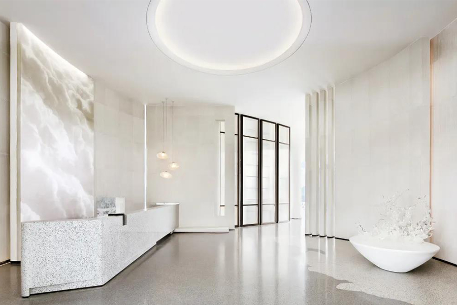 前廳區的設計以淺米色系為基調,大面積素色的石材彰顯溫潤而雅致的品位,地面通過由淺至深的水磨石營造出海浪肌理,與具有動態效果的藝術裝置融合,讓空間充盈著豐富的韻律和節奏,清雅卻又洶涌如潮。鯨時不時躍出海面,撲騰出美麗的水花,猶如一名跳水運動員般優雅又豪邁地扎進水中。表達無比的喜悅,展現優美的身軀,吸引并尋找同頻共振的靈魂伴侶。
