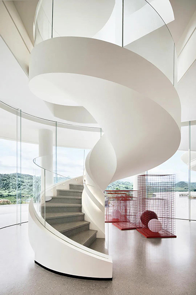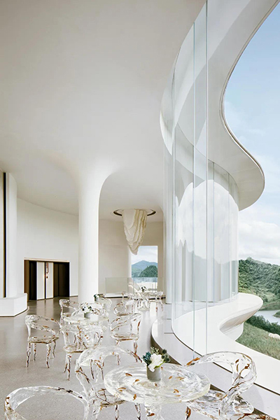 “在剛接手這個項目時,項目小組的成員們,沒人敢定義這個優美曲線,好似在打造一個夢境的空間。J&A設計師通過對建筑、光影、材質的對話,最終選擇與建筑意向相符合的“云藝術館”的設計主題,推敲出“漫步云端”設計理念,以自然文化作為背景,藝術作為啟承,詮釋自然、藝術與生命的情感鏈接,讓觀者能從忙碌的都市生活中短暫抽離,充分感受悠然時光。”