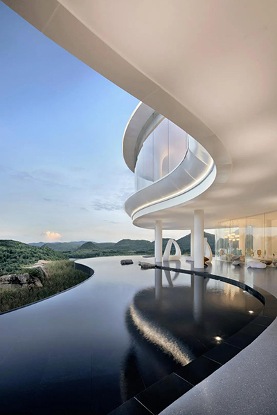 懷著對自然的敬畏與熱愛, J&A以“云藝術館”為設計理念,衍生出“漫步云端”的設計概念,結合當地“云霧,山川,湖泊”等自然文化元素,使建筑、人文、自然三個維度相互融合和襯托。并通過運用穿插,解構,曲線感的藝術設計手法,來打造與生活并行的通透,流動的藝術展示空間。設計師選取了帶有“鯨”,“云”,“舟”元素的藝術裝置,作為空間故事線索,誕生出出其不意的美好藝術,完整的詮釋出漫步云端亦是觀云舒霞卷的境遇。