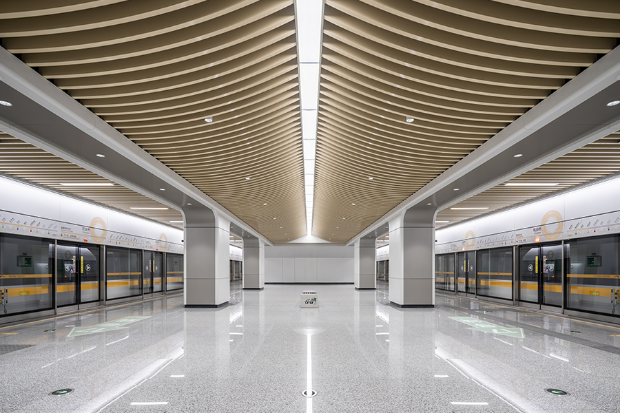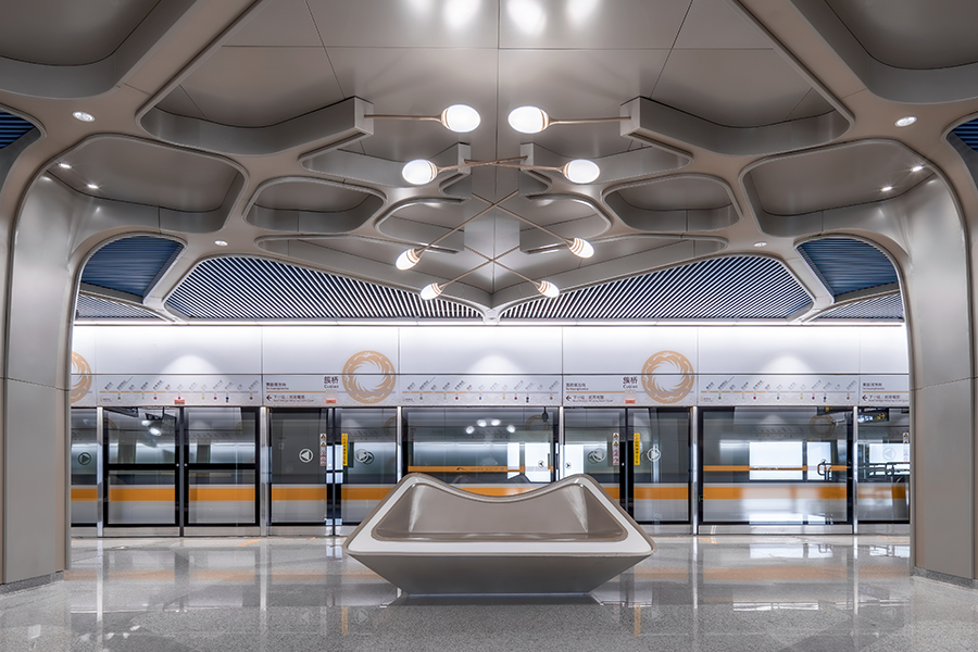 機(jī)投橋站以“織錦文化”為設(shè)計(jì)主題,將傳統(tǒng)蜀錦織布機(jī)和傳統(tǒng)建筑造型作為空間的創(chuàng)作起點(diǎn)。天花流暢的線條結(jié)合人字坡傳統(tǒng)形態(tài),仿佛布匹織錦的韻律貫穿整體空間。并在空間局部延展至墻面,將織造的美感大膽與傳統(tǒng)建筑進(jìn)行拼接,形成獨(dú)特的新舊對話,體現(xiàn)了“蜀錦歷史名鎮(zhèn)”的風(fēng)采,合力發(fā)揚(yáng)傳統(tǒng)工藝的工匠魅力,延續(xù)歷史空間記憶。
