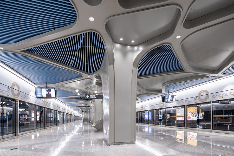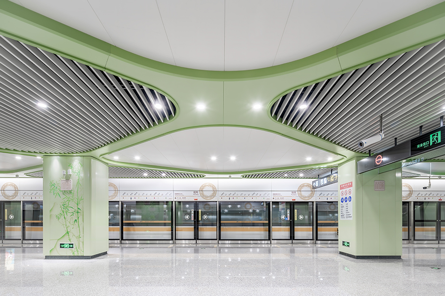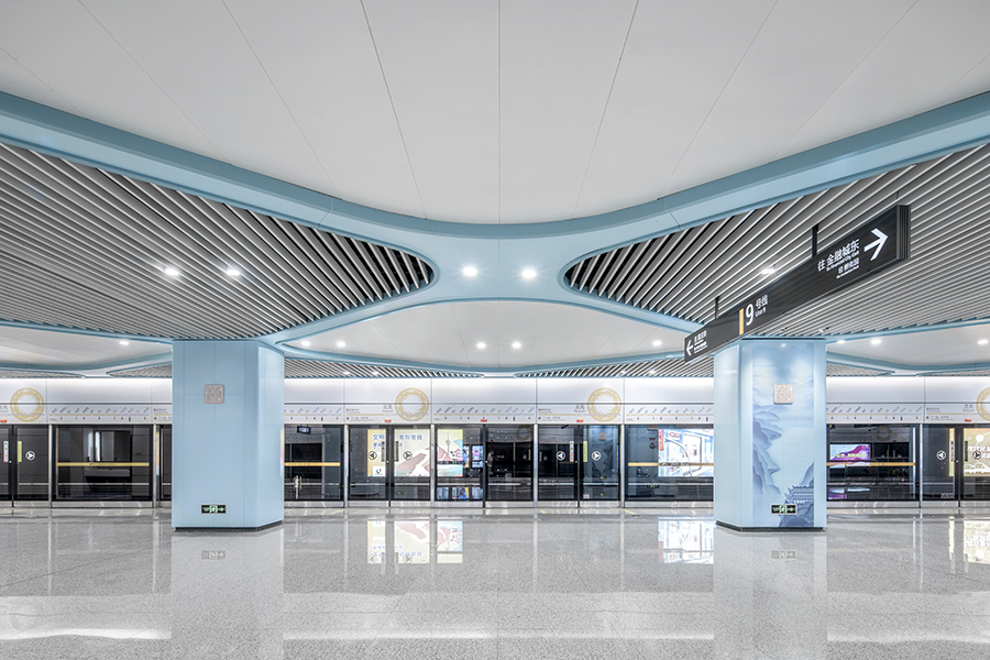一般藝術(shù)站共9座車站,J&A以“巴蜀錦繡、魂之凝結(jié)”為基石對蜀錦蜀繡文化最具代表圖案“芙蓉”進(jìn)行結(jié)構(gòu)提煉,重組轉(zhuǎn)化為抽象的元素在空間進(jìn)行一體化表達(dá),使整個(gè)車站形成一個(gè)富有獨(dú)特文化氣質(zhì)的空間。車站空間結(jié)合周邊文化特征局部表現(xiàn)呼應(yīng)地域特征,用藍(lán)綠兩色代表「川西林盤」、「秀麗錦江」,自然孕育世間萬物,將自然風(fēng)光與城市軌道交通相融合,體現(xiàn)蓉城人民的包容和豁達(dá)。