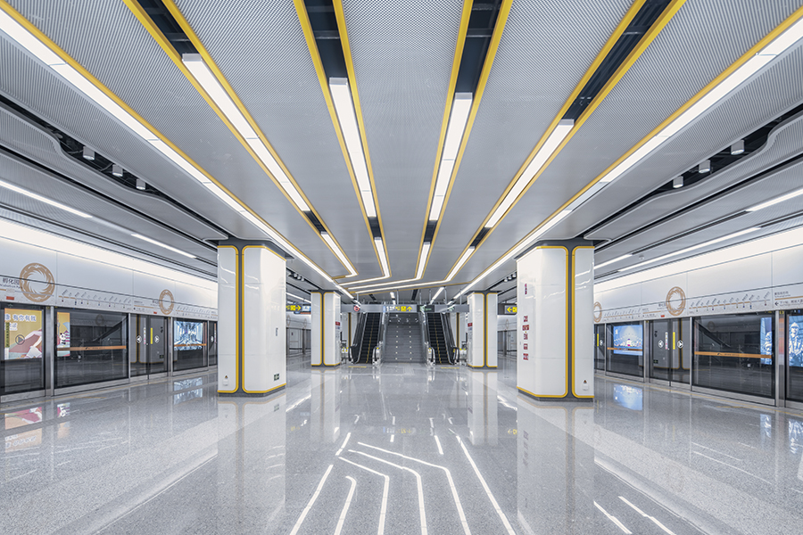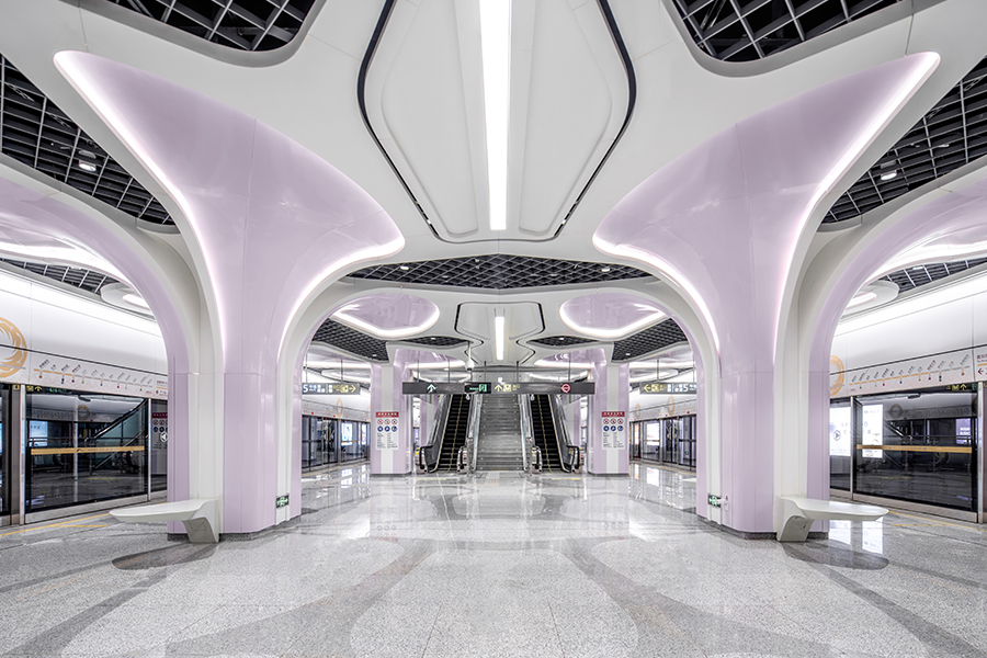 錦城大道站以“錦繡蓉城”為設(shè)計(jì)主題,提取市花“芙蓉”,運(yùn)用到柱子進(jìn)行一體化設(shè)計(jì),柱子之間形成一條貫穿站廳的廊道,營造生態(tài)自然的氛圍,將成都的生態(tài)文化融入站點(diǎn)設(shè)計(jì),體現(xiàn)成都人民休閑生活慢行的狀態(tài)。