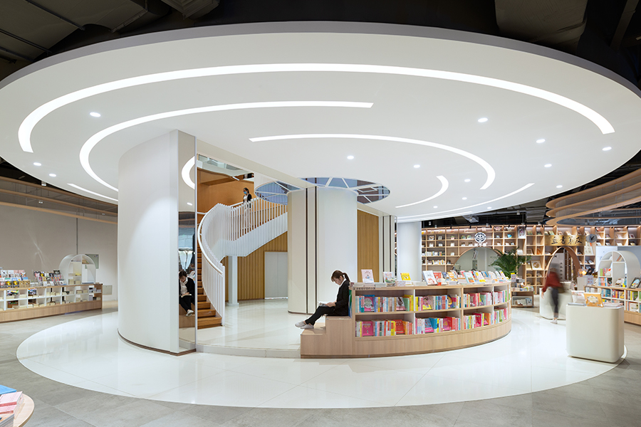 圓區(qū)定位家庭及兒童人群,采用更為活潑的圓形與曲線(xiàn)布局,整體的色彩搭配上更為明亮簡(jiǎn)潔,運(yùn)用清爽的白色與溫馨的木色調(diào)。流暢的曲線(xiàn)書(shū)墻將空間進(jìn)行劃分,增加穿行的趣味性。