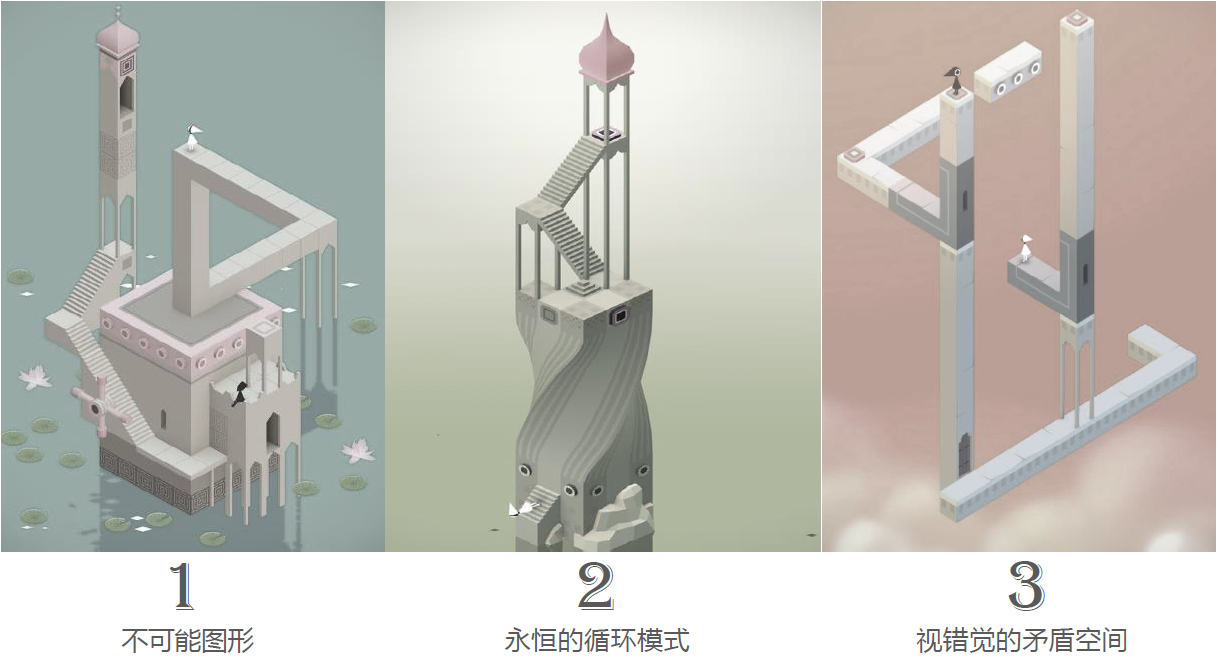 “紀念碑谷”這款游戲之所以讓人喜愛,不僅因為它在美學設計上的驚人表現,同時它還嫻熟地將矛盾空間放在二維世界中,讓玩家在解謎的同時,沉浸在這錯落有致的矛盾空間當中。