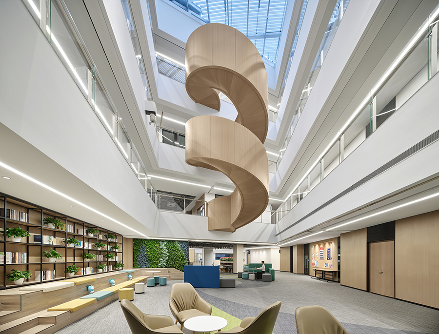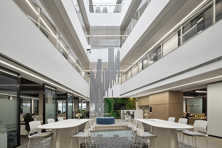 建筑本身由商業空間改造,整個設計過程充分利用原有商業中庭,在北區、南區、東南區打造出3個挑高及采光都極其優秀的公共區域,融合茶歇、溝通、閱讀、臨時辦公等功能,為在此辦公及到訪的人群打造出多場景的社交空間。