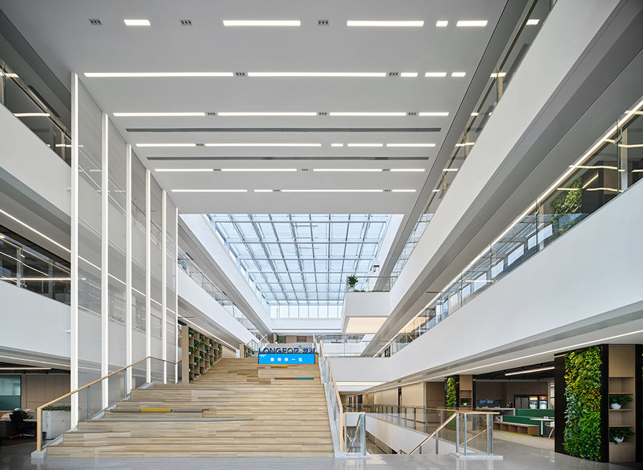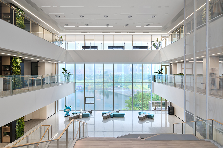 拆除原建筑扶梯通道后的南中庭,因開闊的內部空間及采光玻璃頂,光影效果極其豐富,南側跨3層的落地玻璃幕,更是將龍塘湖景色盡收眼底。進入南區中庭的陽光幾乎實現360°覆蓋,包裹綠植的柱體設計,加上頂部的通風集成,該區域充分與自然元素交互,沁人心脾。