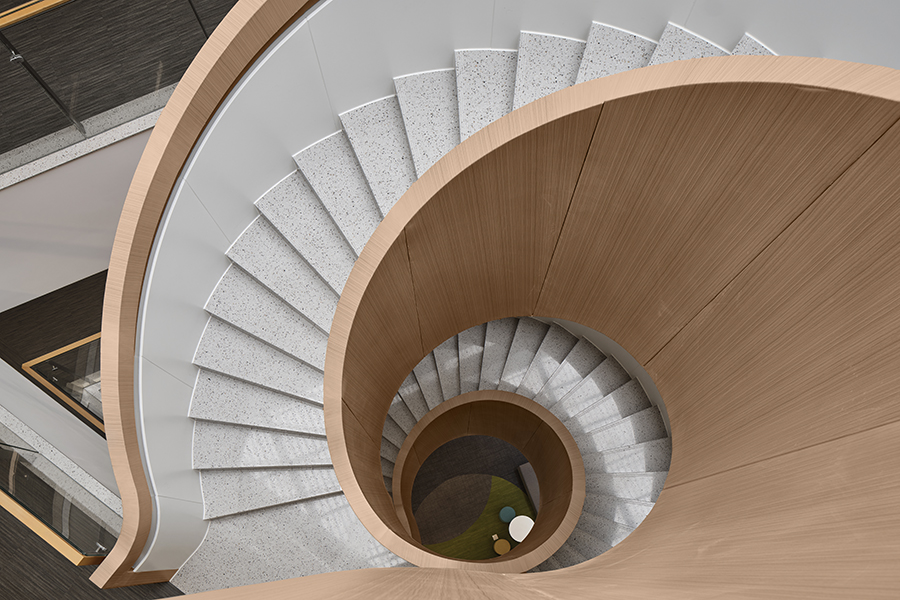 向東南區域深探,靜謐的腹地,是陽光浸潤的共享書吧,沒有密集的鍵盤敲擊聲響,沒有屏幕的強光,舉目之處是緩緩向上的旋梯,彰顯斐波那契數列之美。通道間,卡座與旋梯接連呼應,綿延向前。