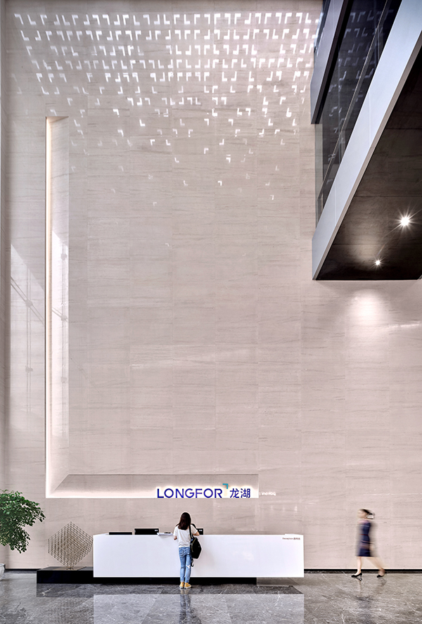 J&A始終認為,“企業總部的文化和精神根植于每一處空間,應保持內外格調的統一和連貫性,避免割裂感”。在大堂區域,呼應建筑外形的簡潔恢弘,J&A致力于營造空間的通透感和大氣感,5層17米的挑高帶來視線的開闊,天花上不規則排列的“L”型鏤空打破了頂部的壓迫感,透光的同時映射下斑駁投影,為理性的大堂空間帶來藝術的靈動。超級符號“L”一路從天花投射到立面,進而以恢弘的氣勢延展到接待臺背景墻,高達10米的“L”型燈槽與品牌標識的結合,無時不刻令觀者感受到龍湖的品牌文化。作為到訪者進入空間的第一站,人才、技術、信息、智慧、機會等,一切匯聚于此,進而生生不息。
