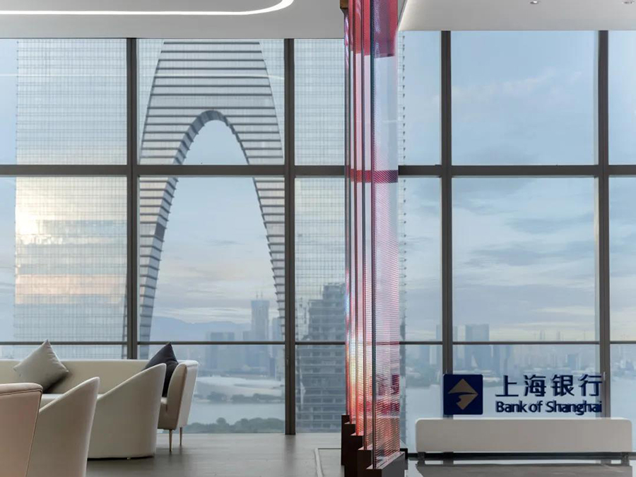 大面積的玻璃幕墻讓窗外的景色一覽無余,“東方之門”矗立在金雞湖畔,更遠(yuǎn)處,湖面與天色交相輝映,別有一番意趣。幾塊透明玻璃屏似隔非隔,屏幕上展示著上海銀行的核心理念和服務(wù)宗旨,亮眼的紅色和藍(lán)色在整體以低調(diào)沉穩(wěn)的商務(wù)氣質(zhì)為主的空間里,格外醒目。