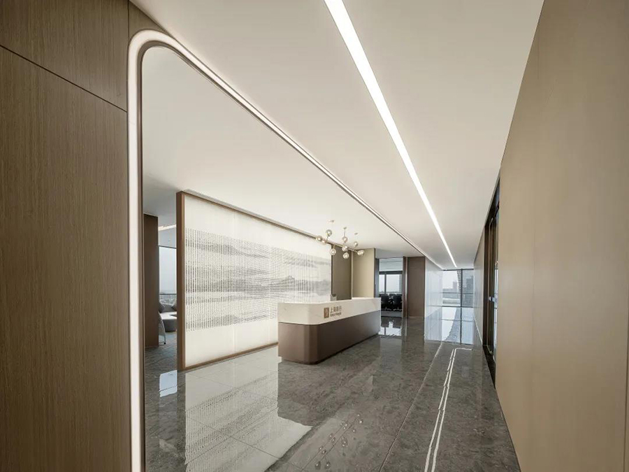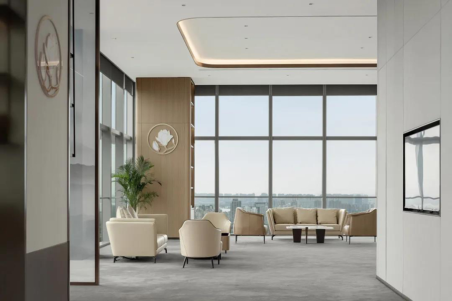會(huì)議層的前廳接待空間作為公司重要的形象展示場所,通透而開闊。半遮擋的山水藝術(shù)玻璃屏風(fēng),界定空間的同時(shí),又不阻擋視線的延伸,使得映入的光線也具有一種朦朧的美感。