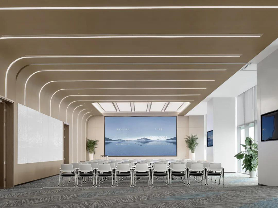 報(bào)告廳為復(fù)合功能空間,活動(dòng)隔斷可將其分為三個(gè)小型培訓(xùn)室,墻面采用穿孔吸音板,以保證吸音效果,天花則用木紋鋁板,同時(shí)嵌入線性光帶,既體現(xiàn)出科技感,又能提升空間的品質(zhì)。