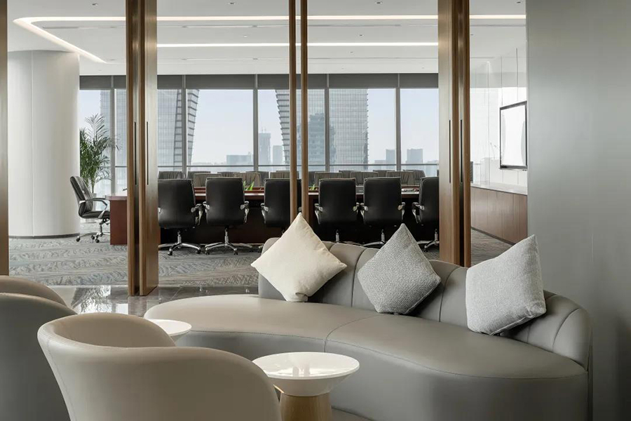 前廳接待區(qū)緊挨著會(huì)議室,通過隔斷門的使用,讓空間實(shí)現(xiàn)開放和私密之間的轉(zhuǎn)換,滿足不同的需求,可以是客戶接待場所、員工休閑區(qū)、等候區(qū),也可以作為會(huì)議期間的休息區(qū)。
