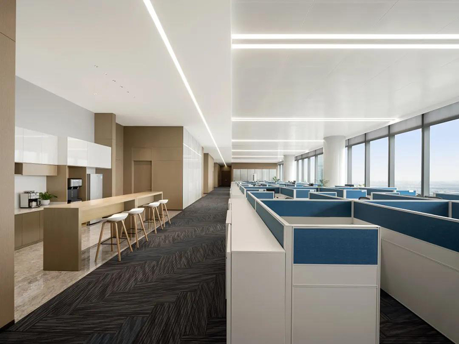 開敞式辦公區(qū)整體造型簡約大方,視覺效果也更加的開闊。大面積的落地窗使光線最大化進(jìn)入室內(nèi),營造出柔和、明亮、舒適的辦公環(huán)境。水吧區(qū)以木色和白色為主,在緊張而忙碌的氛圍里,另辟出一塊溫馨舒適的區(qū)域。