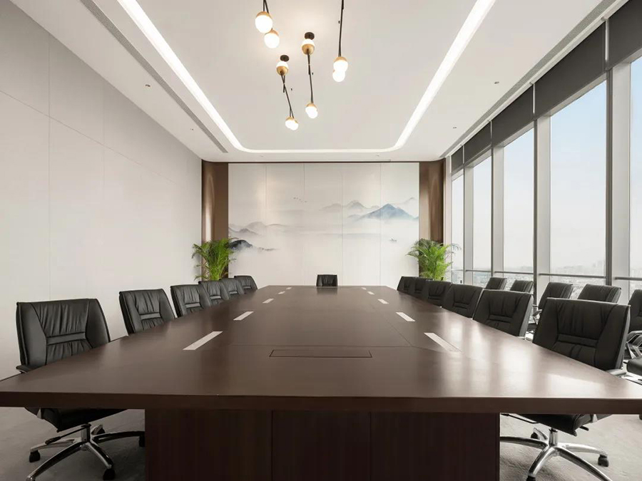貴賓會(huì)議室臨窗而設(shè),木質(zhì)和皮質(zhì)材料的使用,傳達(dá)出一種沉穩(wěn)、內(nèi)斂的氣場。作為重要的會(huì)議、接待場所,整個(gè)會(huì)議室風(fēng)格莊重、嚴(yán)肅,但簡約燈飾和山水畫的點(diǎn)綴,又讓空間不至于太過沉悶。