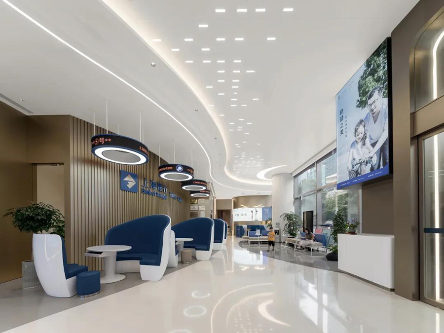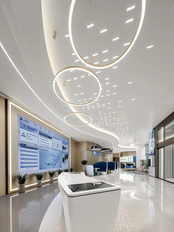 天花與營業(yè)廳的流線相呼應(yīng),也采用曲線造型和層次設(shè)計(jì),一眼望去,宛如江南水鄉(xiāng)的河岸,燈光穿過不規(guī)則穿孔鋁板,映射在淺色的瓷磚地板上,如同河面波光,粼粼閃動(dòng);又如斑駁星光,星星點(diǎn)點(diǎn),充滿生氣。