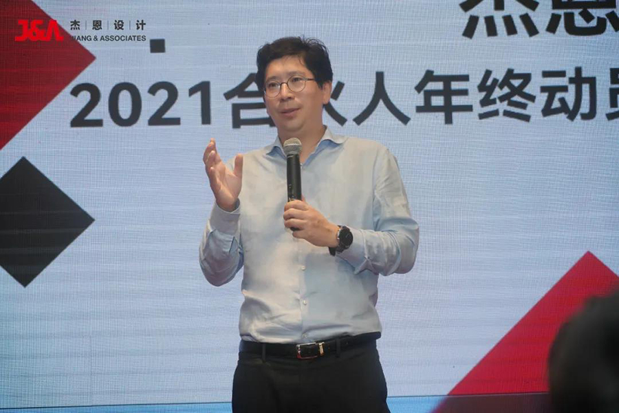 逐夢之旅,永不止步。晚上的動員大會上,J&A董事長、總設計師姜峰先生上臺進行開場致辭。