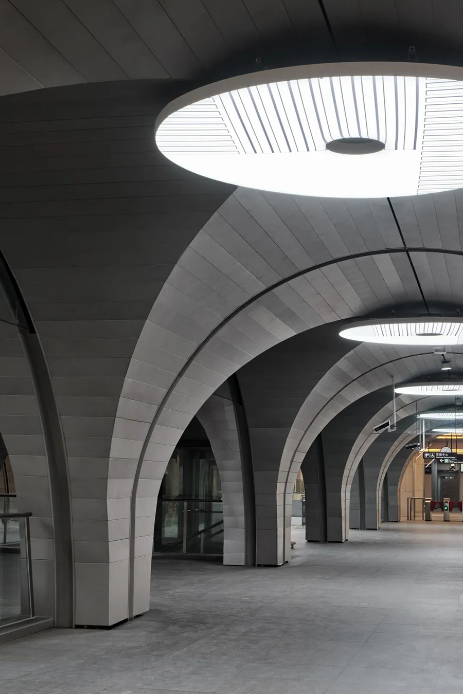 車站空間的設計充分考慮周圍的環(huán)境、建筑風格、未來定位,以雅致的拱形設計, 賦予空間更多想象。圍廊頂部的亞克力與鋁板形成的不同形態(tài)的區(qū)塊與未來將形成的不同服務體塊遙相呼應。