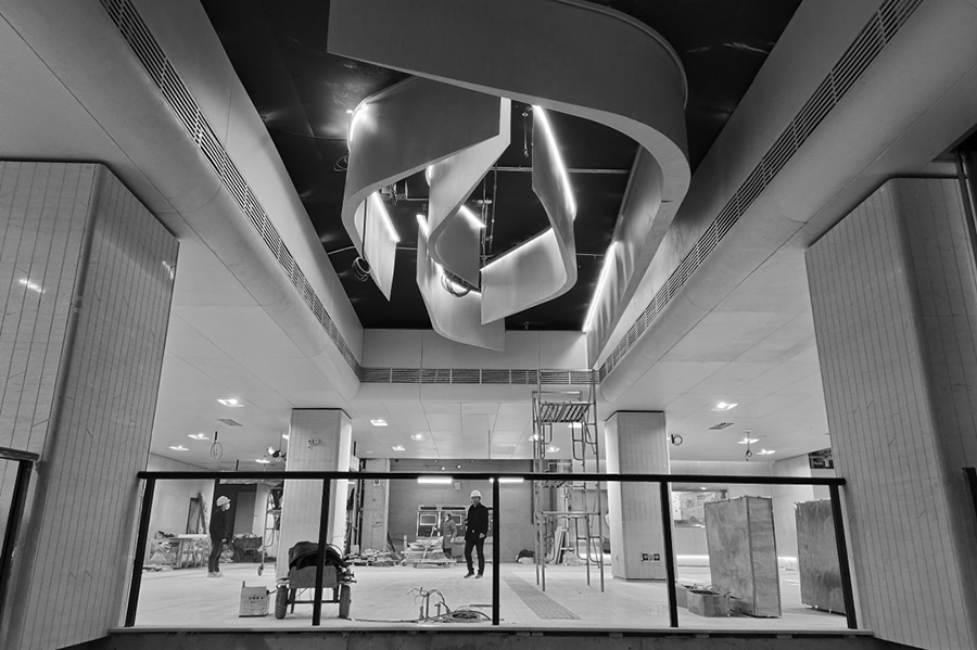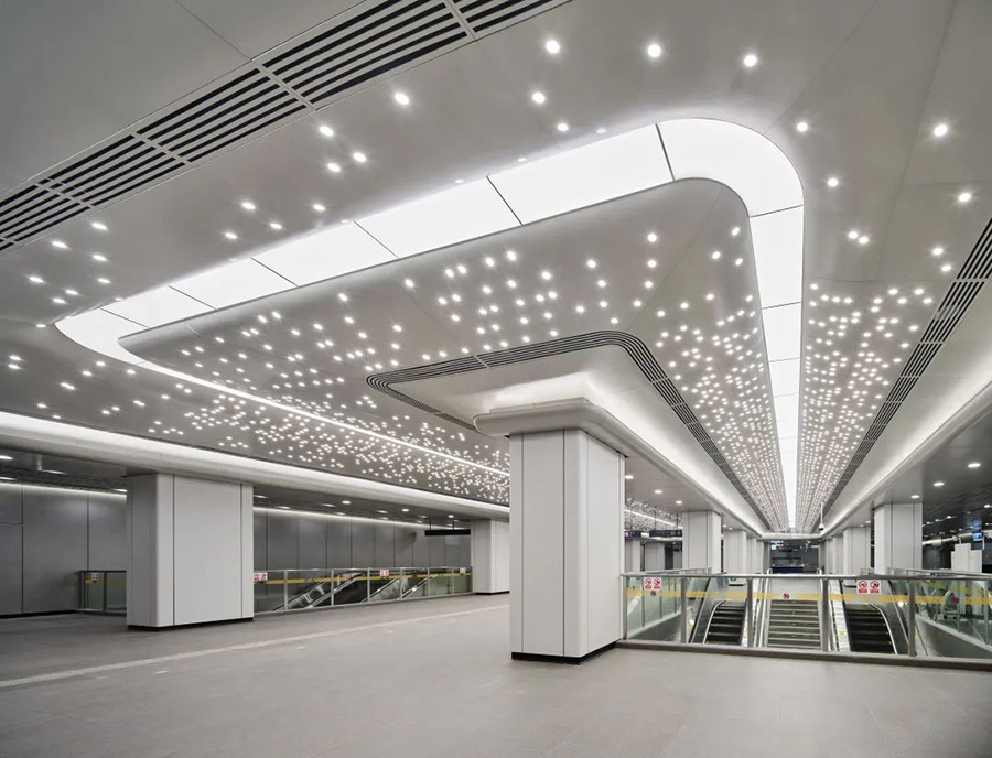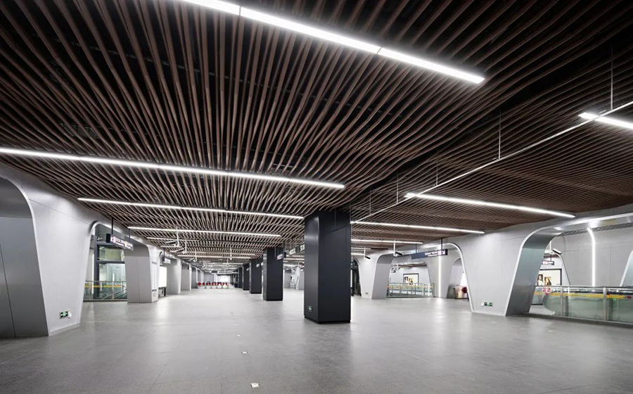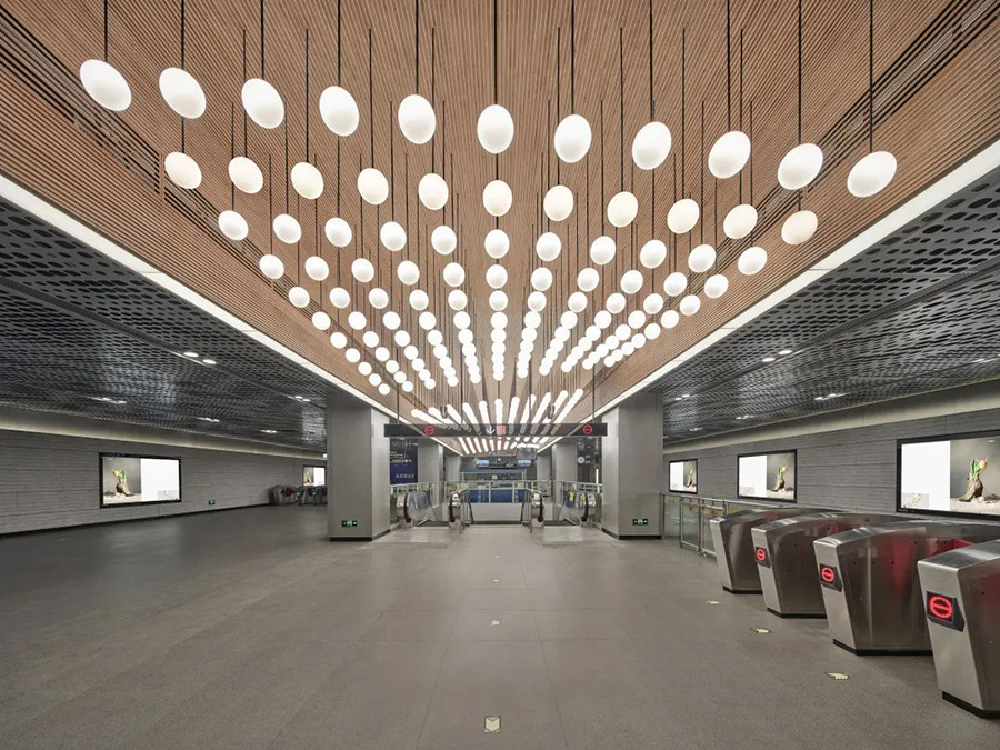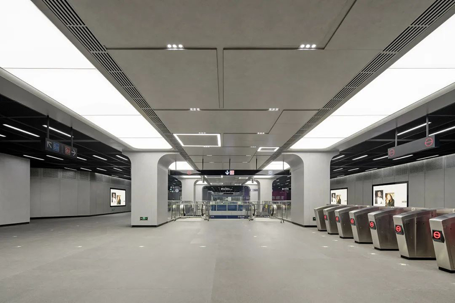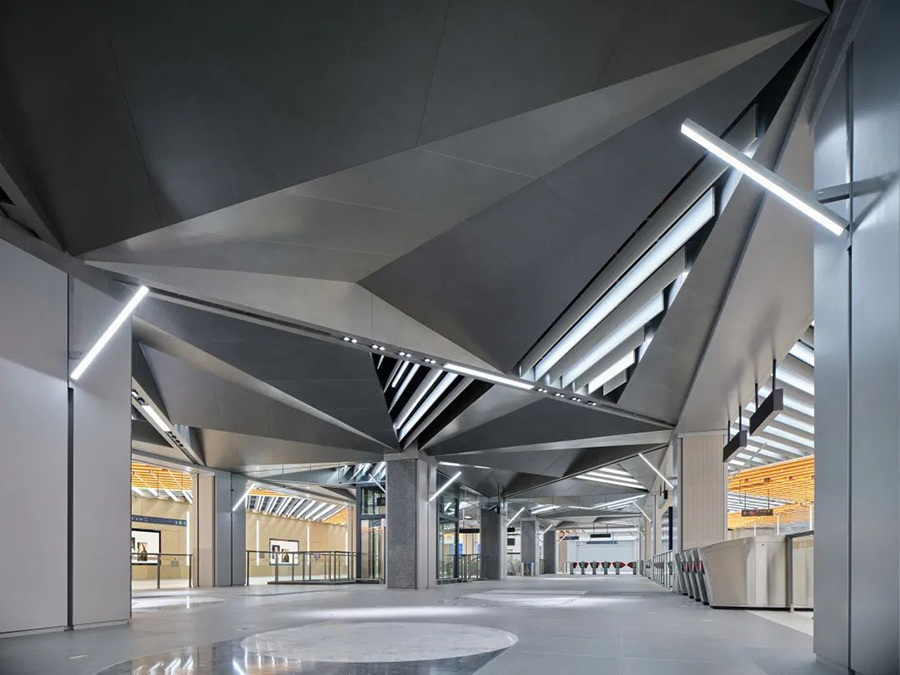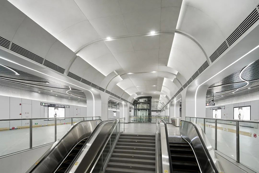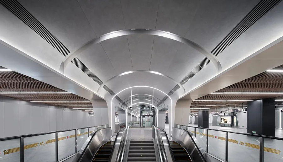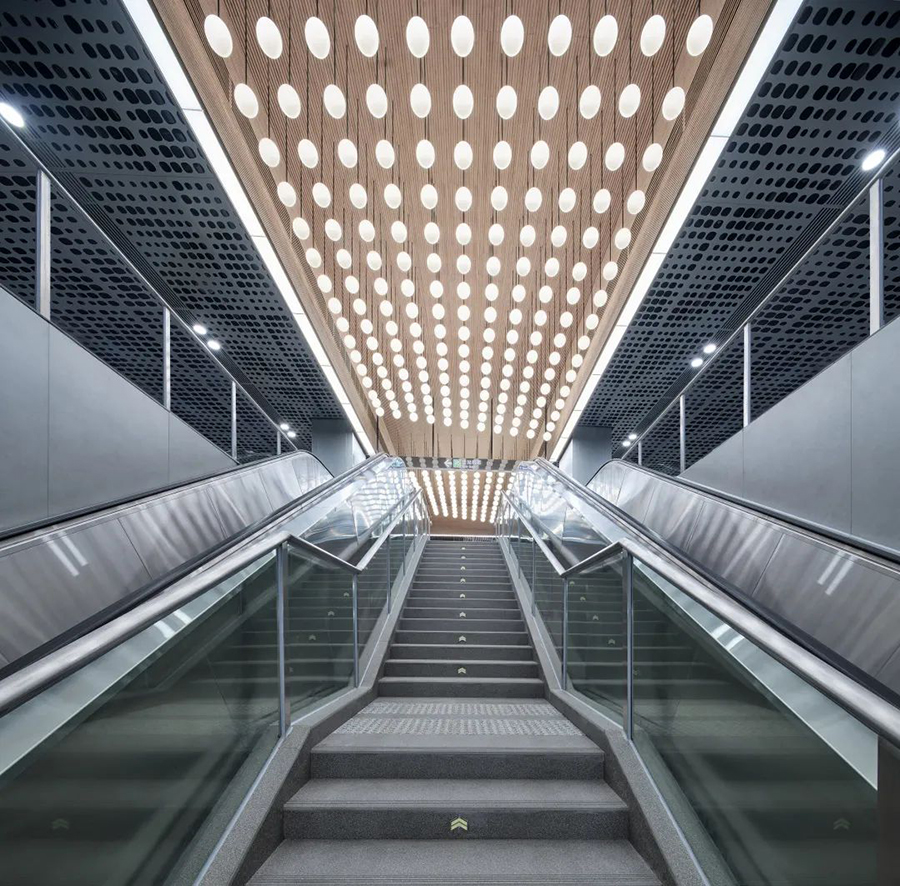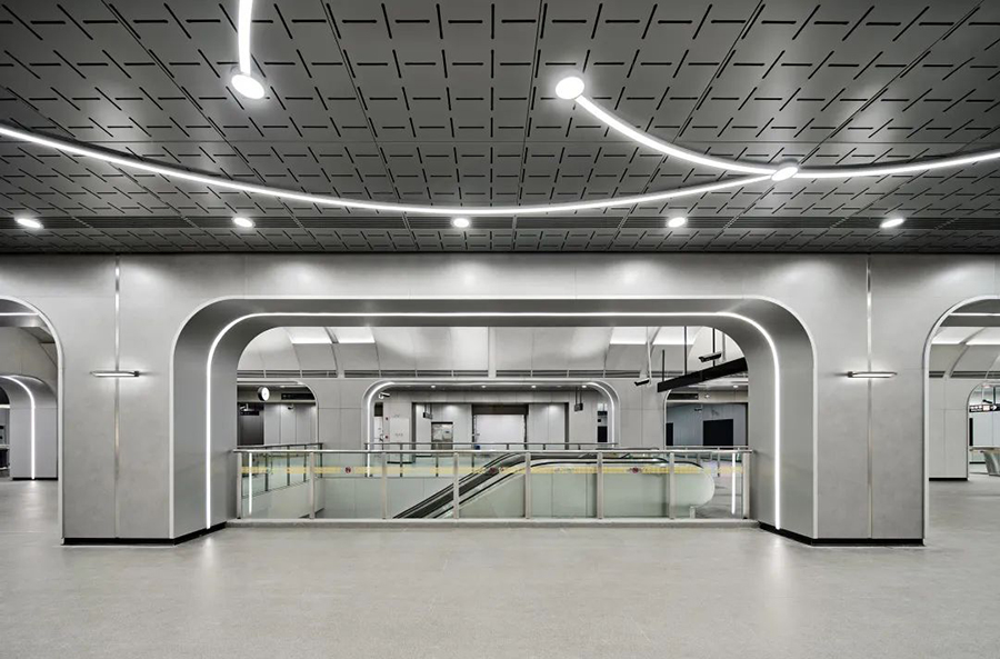 觀音塘站以“經(jīng)緯線”為設計靈感,空間由千絲萬縷的線條穿插編織而成,以此作為城市情感的紐帶,在空間里編織出專屬于這個城市的記憶。