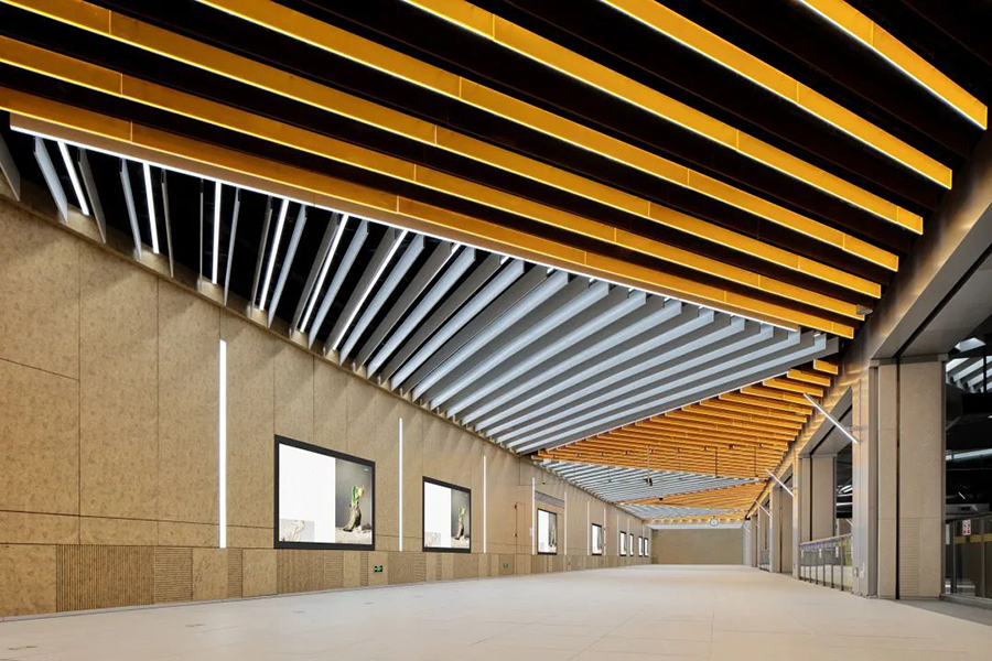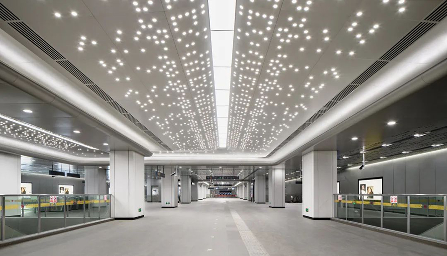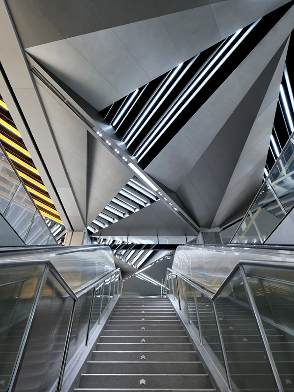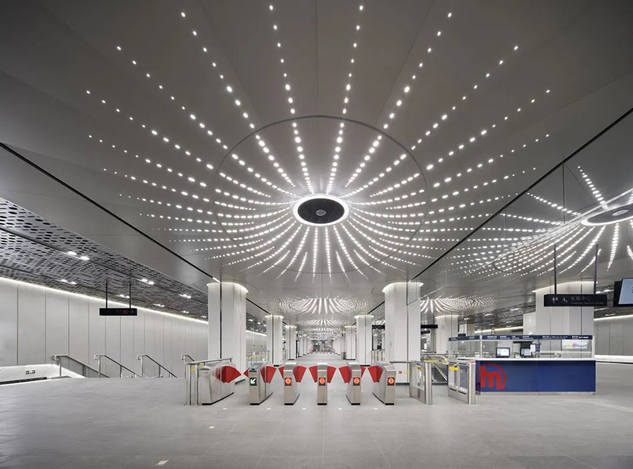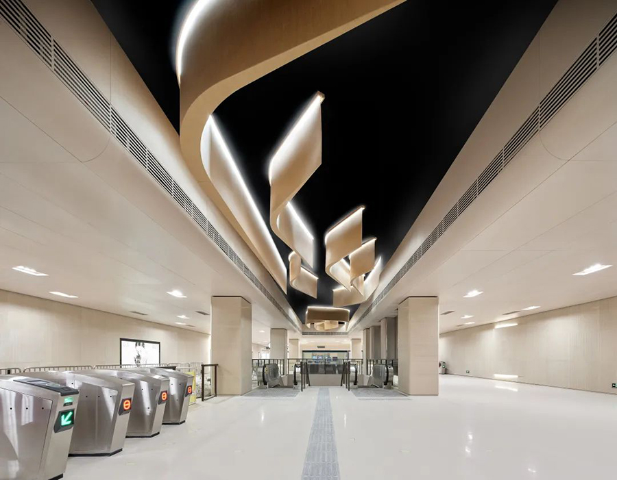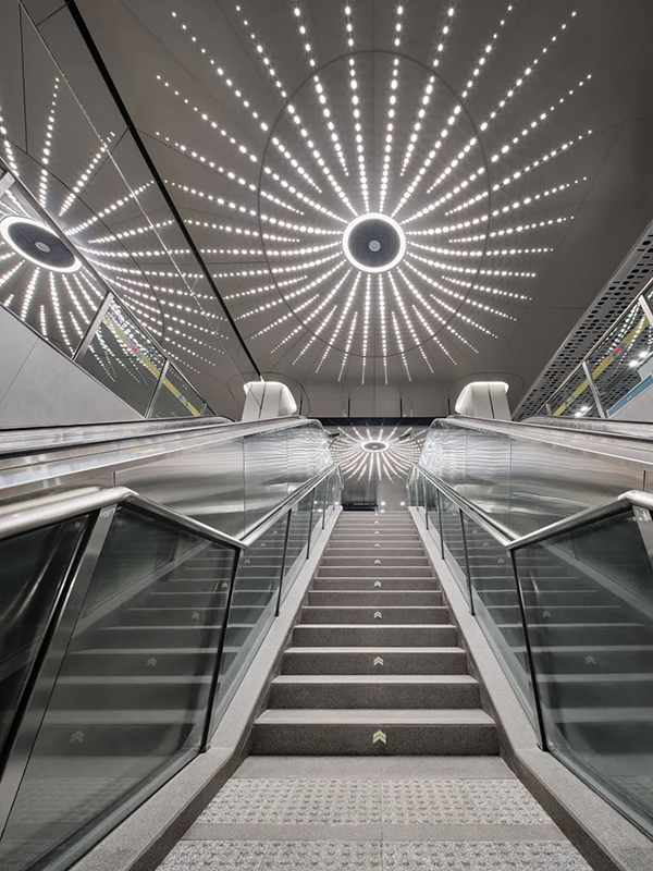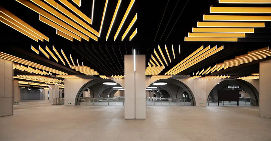 御道站屬于“連堡豐城”起點,定位為空鐵樞紐,是城市之間緊密相連的通道,延展了城市居民活動的空間,提高了杭州的城市發(fā)展服務水平。空間以燈光的串聯(lián)展現(xiàn)空鐵樞紐運作軌跡,展現(xiàn)城市物聯(lián)生活新生態(tài)。