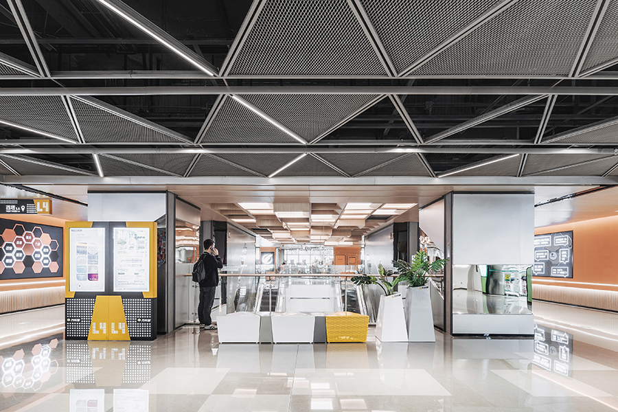 結合項目定位,J&A在空間設計里,瞄準年輕的受眾群體,從細微處凸顯空間的科技感、時尚感,帶來一個融合多元場景、互動體驗和無界社交的購物空間。