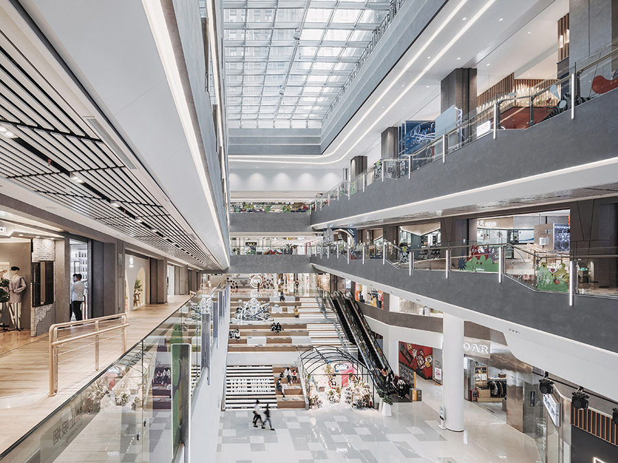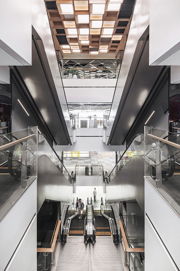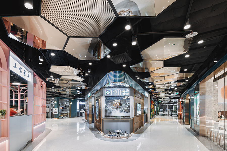 為擴大整個購物中心的空間感,天花與柱體運用鏡面不銹鋼等材料,將現代感與人文質感相融合,使得受層高限制的空間無限拉伸。