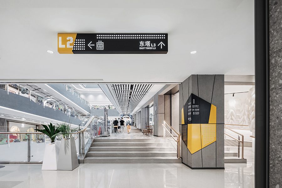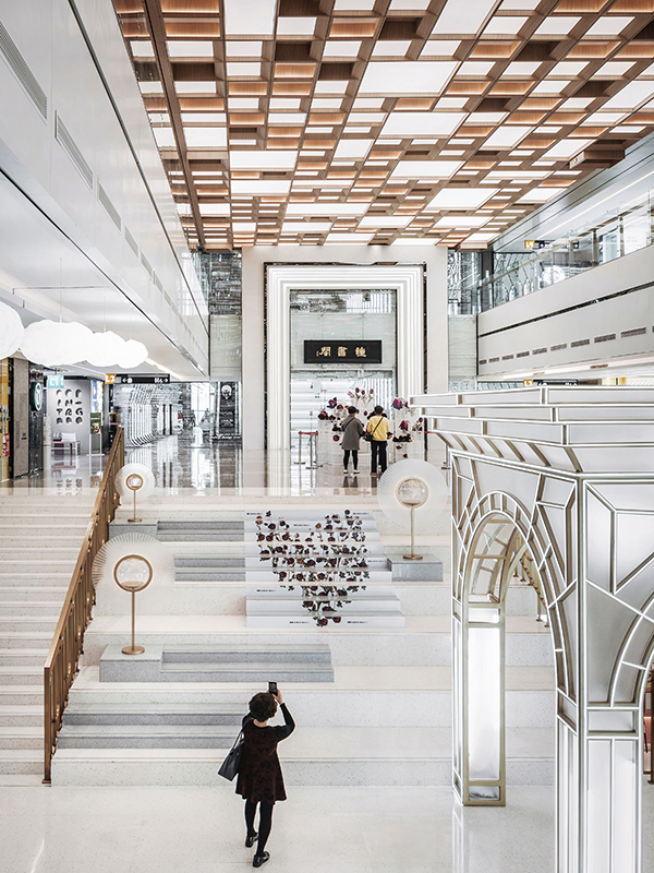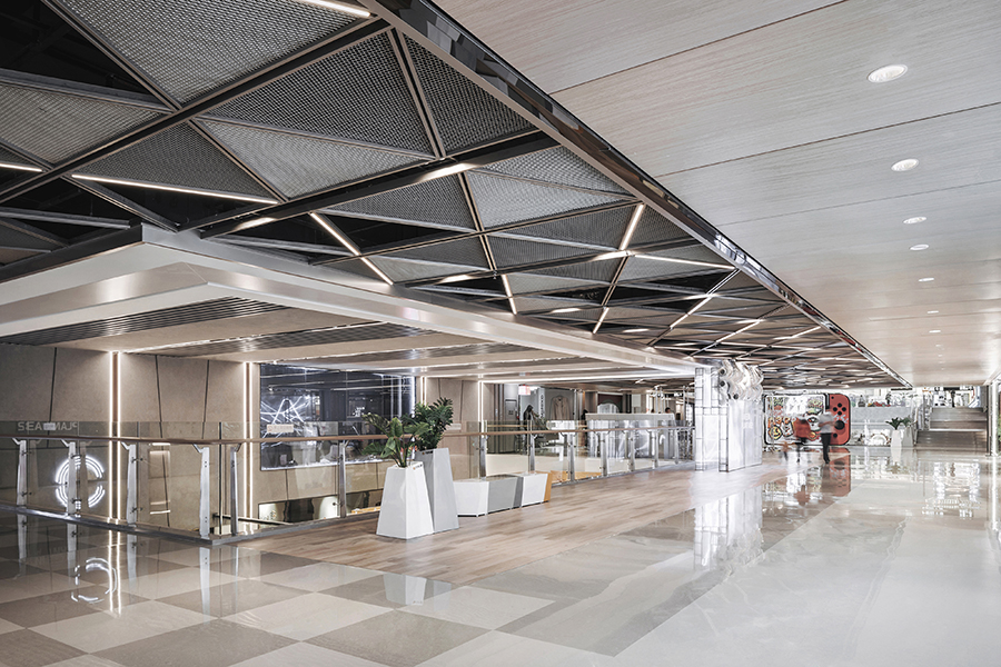 富有虛實變化的鏡面反射效果,給空間增加了更多趣味性。東區特色天花利用平面圖案,形成強烈的視覺張力,豐富了天花的層次感。