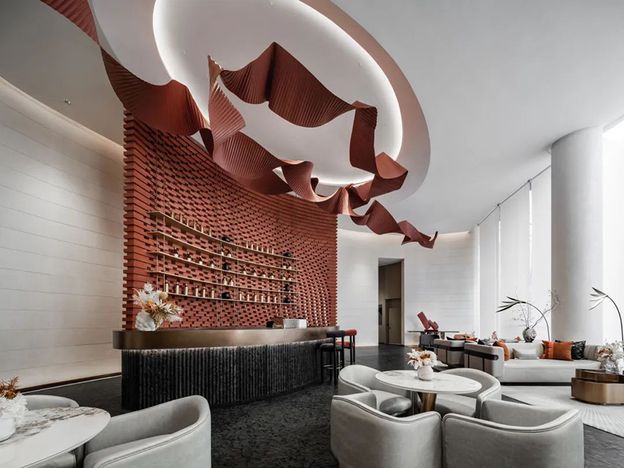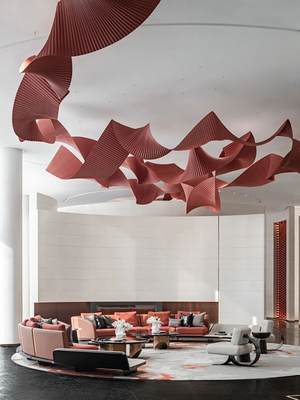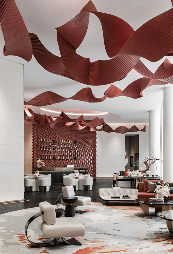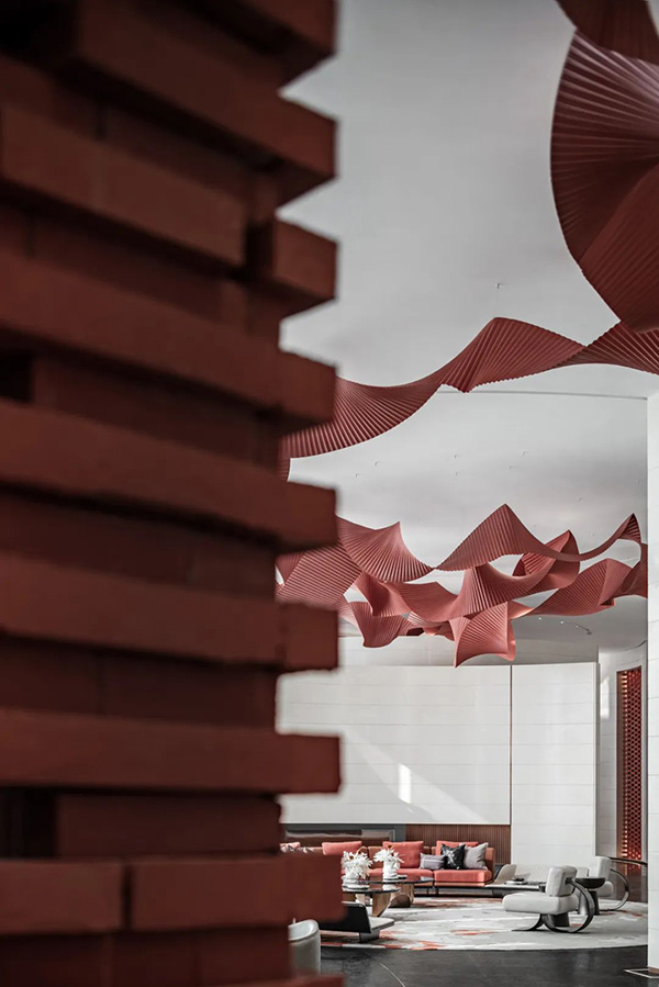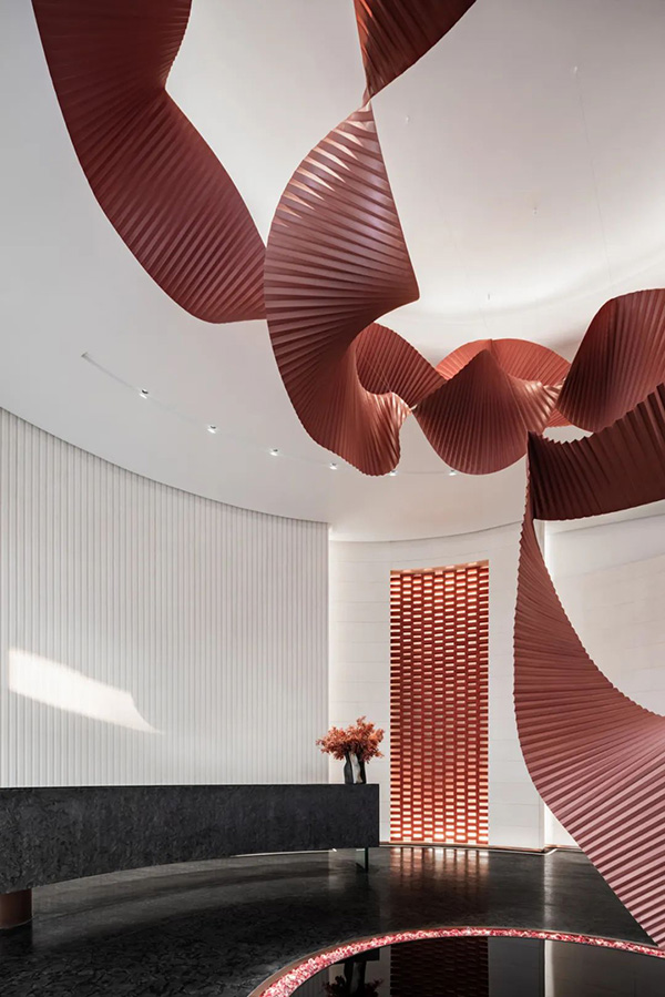 接待廳以鳳舞為靈感,使用折紙藝術將鳳凰婉曲秀麗、柔美嫵媚的姿態具象化,流動的造型穿過整個營銷中心空間,如同鳳凰飛過留下的虛影。