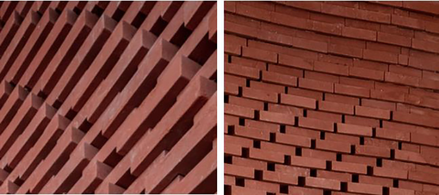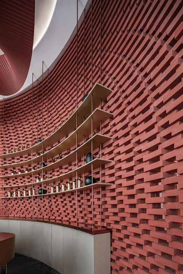 在水吧區,設計團隊用紅磚堆疊出“鳳凰頭冠”的鏤空墻體,以錯落有致的造型搭建出一道特別的藝術墻。