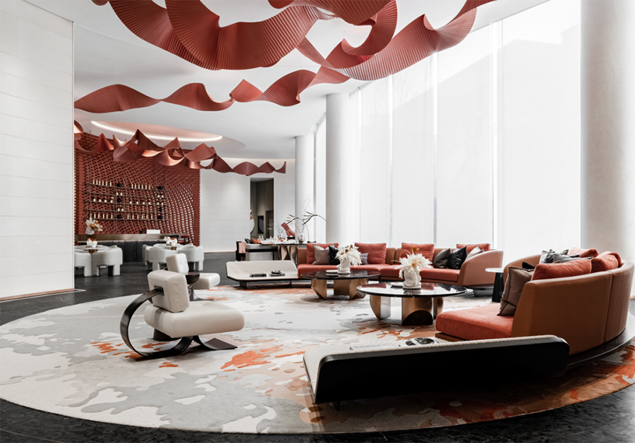 用設計回應城市文脈,J&A杰恩設計在整體室內設計中,以“百鳥朝鳳”為主題進行延展,融入國潮特色,將古老的文化用一種新潮的方式表現,呈現一個充滿藝術氣息、文化底蘊的逸生活美學中心。