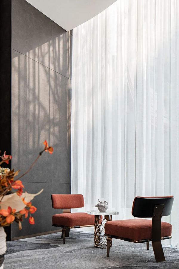 洽談區延續接待廳的色彩搭配和設計風格。抽象化鳳凰元素環環相扣,相得益彰,無論是沙發的弧線、邊幾的曲線、落地燈采用的羽毛造型,都與鳳凰優美的姿態和柔性特征相呼應。鳳凰振翅的意象明晰而具體,化作空間的藝術品點綴。