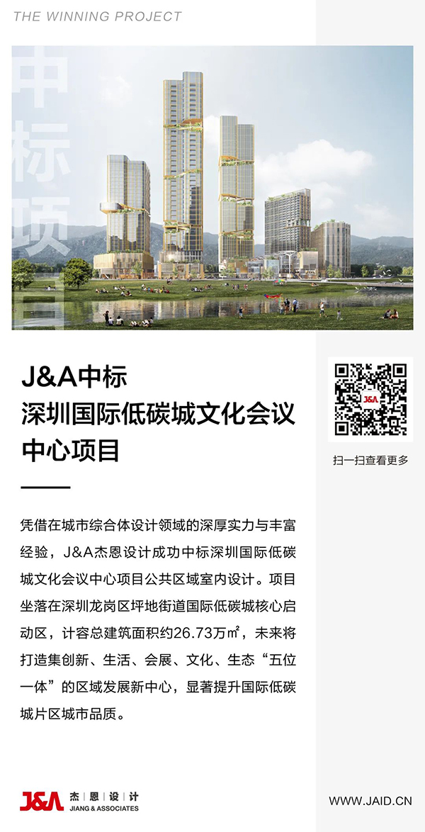 J&A深耕城市綜合體設計多年,始終致力于用設計賦能城市發展,深度踐行可持續設計理念,將碳中和目標下的可持續設計全面融入企業戰略和核心業務。憑借出眾的實力和豐厚的設計經驗,J&A成功中標深圳國際低碳城文化會議中心項目公共區域室內設計。項目位于深圳龍崗區坪地街道國際低碳城核心啟動區,計容總建筑面積約26.73萬㎡。
