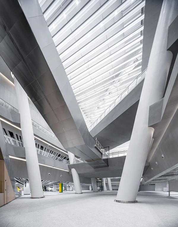 崗廈北綜合交通樞紐以建筑核心天井為基石,提取“陽光發散”的流線形式,采用“費馬螺線”數學原理,賦予空間視覺張力,呈現出簡潔、大氣的空間效果。通過對費馬螺旋線曲率的參數化調整,J&A設計團隊合理設計各空間天花造型尺度,打造既能體現深圳人文關懷,又能承載深圳“匯聚、包容、國際化”特質的軌道交通樞紐站點。