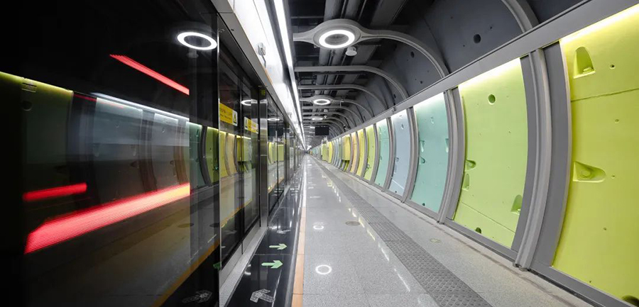 標準站將“樹干”交織造型融入支撐柱,充分體現全線“陽光+生長”的主題,杈椏繁茂,彰顯著向上生長的空間張力。嶂背站以“穿越彩虹的車站”為主題,站臺整體為裸裝設計,結構管片上采用彩虹色系涂料作為裝飾亮點,展露出結構美的同時讓地鐵猶如在“彩虹隧道”中穿梭。
