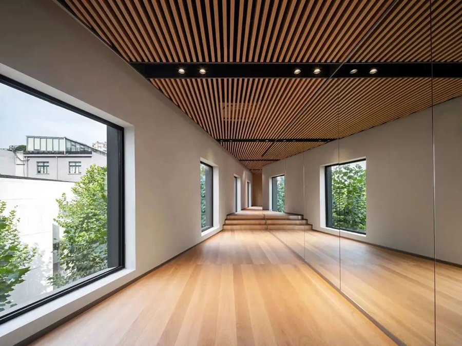 鏡面與燈箱將空間劃分為多個區域,增強了空間的圍合性與延伸感,室外搖曳婆娑的梧桐樹影引入室內,賦予空間蓬勃生機。