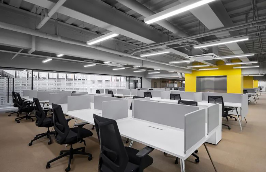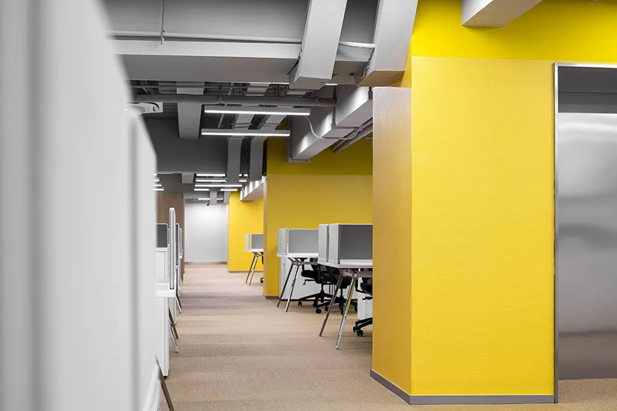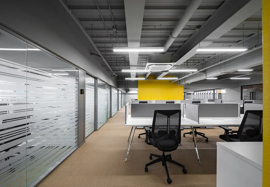 結合柱子和管道設置,設計團隊采用有節奏的片墻隔斷,規避開放辦公區柱子的割裂感。