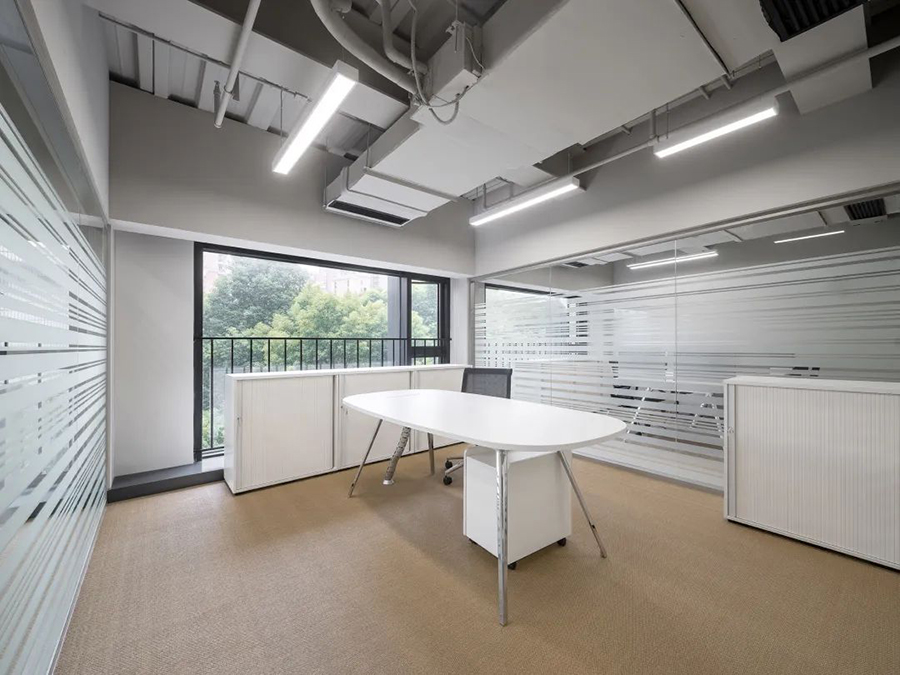 靠窗獨立辦公區的落地玻璃窗讓自然光更多進入室內空間,使得整體空間明快大方,同時也削弱了層高低帶來的壓抑感。