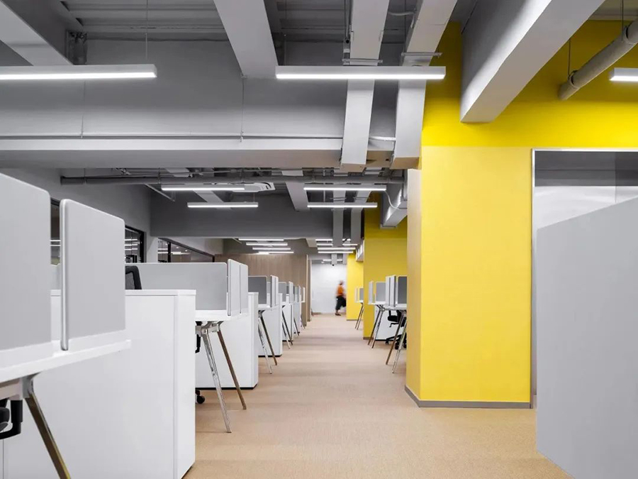 自用辦公區風格也以簡約為主,開放式吊頂與大面積的暖灰色運用,局部添加logo的明黃色讓空間更有活力。