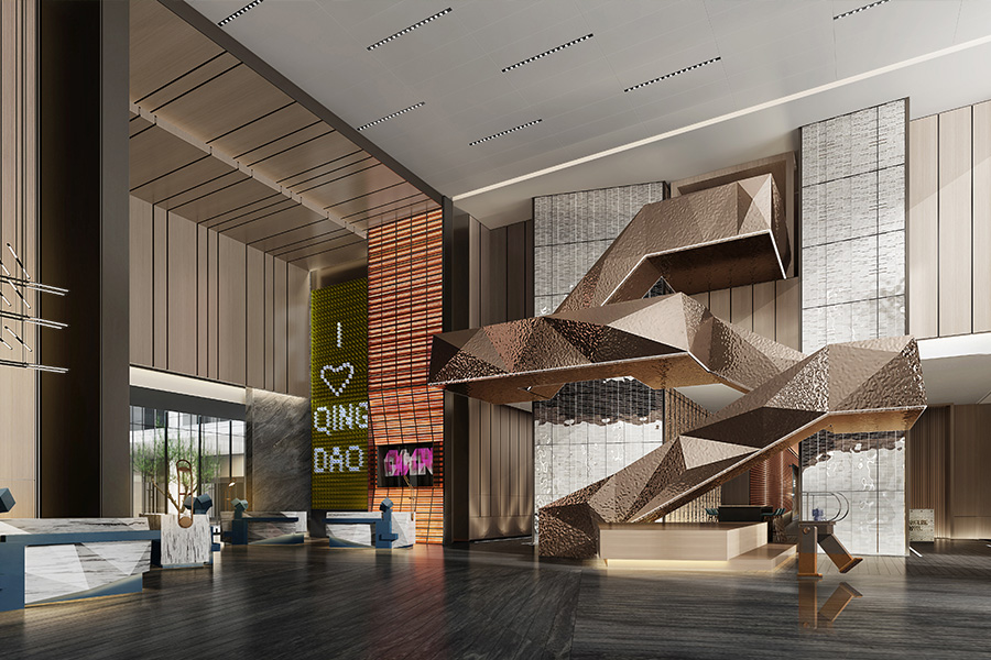 通過提取海浪紋理的元素,形成幾何狀圖形,來代表青島的海。同時,室內大量運用復古的機械裝置,也代表青島在近代中國的工業先驅的一個時代角色。室內以旅行者視角,用電影的記錄方式,將青島的街巷、碼頭、舊車站等城市印跡一一呈現,使傳統文化能以新穎的方式展現、傳承。