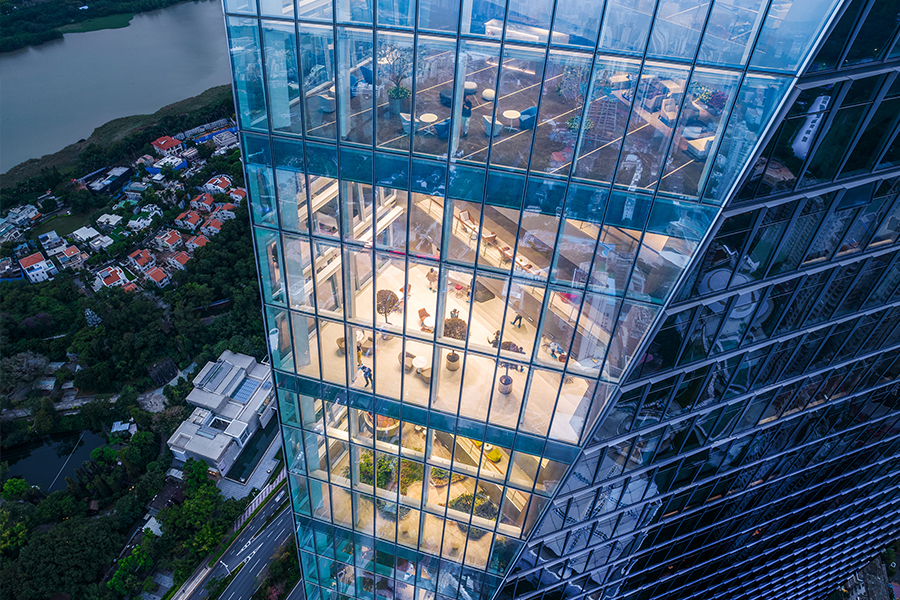 從空中俯瞰,造型獨特、棱角分明的華僑城大廈如一顆精心雕琢的鉆石,矗立在有著“都市綠洲”之稱的深圳華僑城片區中部。