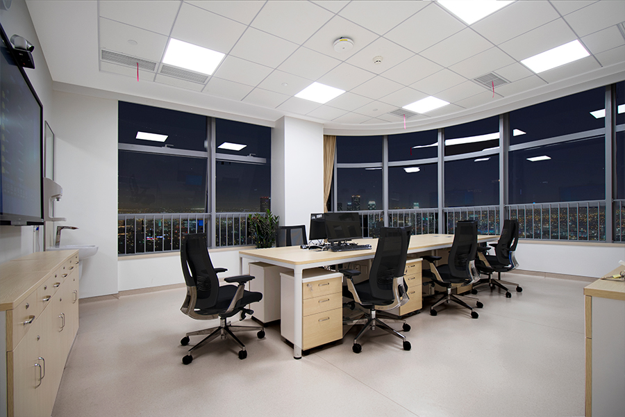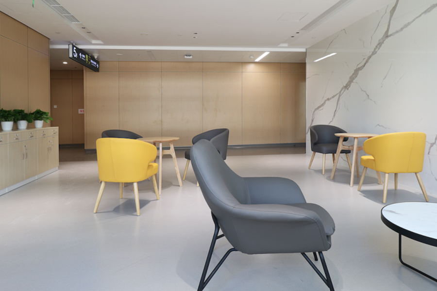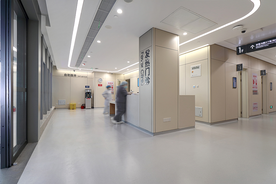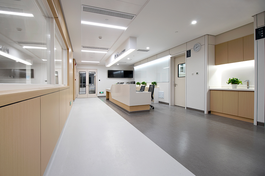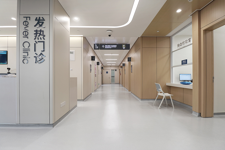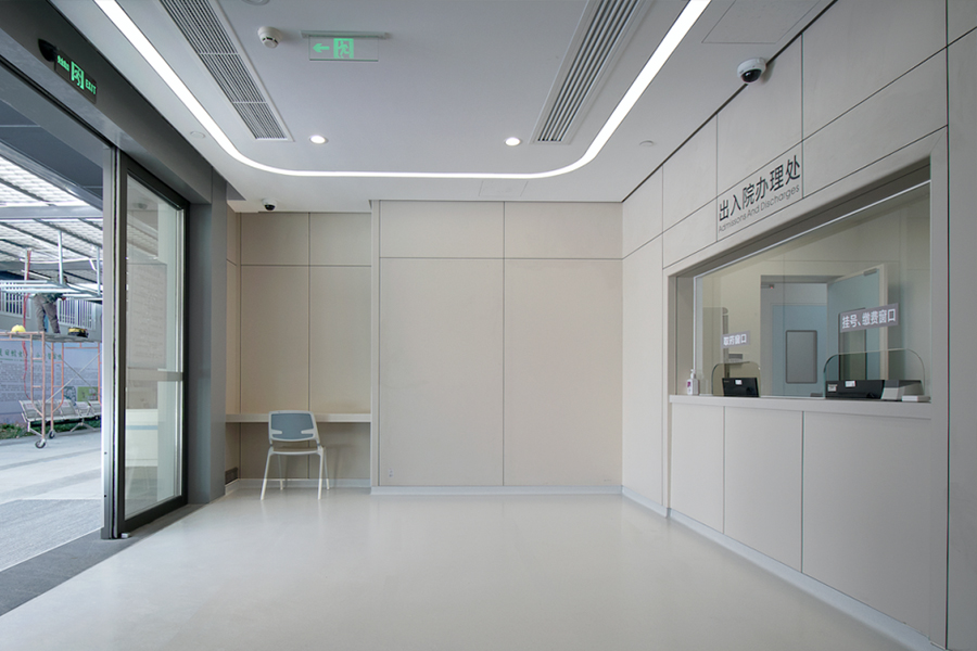 室內(nèi)設(shè)計(jì)也延續(xù)了“平疫結(jié)合”的設(shè)計(jì)理念,減少凹凸造型的設(shè)計(jì),杜絕衛(wèi)生死角,避免藏污納垢。材料方面選擇了抑菌、易清潔、耐擦洗的裝飾材料;板材與板材的交接位置也是采用密封式的設(shè)計(jì)。每一個(gè)細(xì)節(jié)均按疫時(shí)的需求設(shè)計(jì),符合疫情期間的使用需求。抽血檢驗(yàn)室與門診大廳之間的采血窗口設(shè)計(jì)為可關(guān)閉的窗口,窗口開啟后不影響工作人員的正常操作。