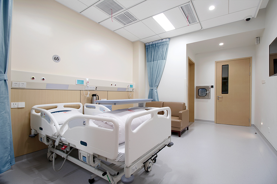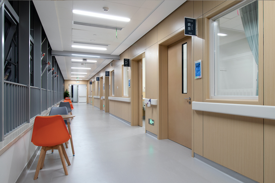 住院病區(qū)嚴(yán)格按照“三區(qū)兩通道”原則設(shè)置,劃分“清潔區(qū)—潛在污染區(qū)(緩沖區(qū))—污染區(qū)”,設(shè)置患者通道和醫(yī)護(hù)通道,并嚴(yán)格按照新型冠狀病毒肺炎防控要求設(shè)置兩個(gè)緩沖間,嚴(yán)格控制院內(nèi)感染。患者走廊靠建筑外側(cè)設(shè)置,患者走廊與病房之間設(shè)置了內(nèi)窗,使病房在符合隔離病房要求的同時(shí),也能獲得更好的采光條件,提升患者的住院體驗(yàn);病房內(nèi)采用暖色調(diào)的設(shè)計(jì),以增加溫馨感,減少病患恐懼,營造如家一般舒適的空間氛圍,從而達(dá)到更好的醫(yī)療效果。