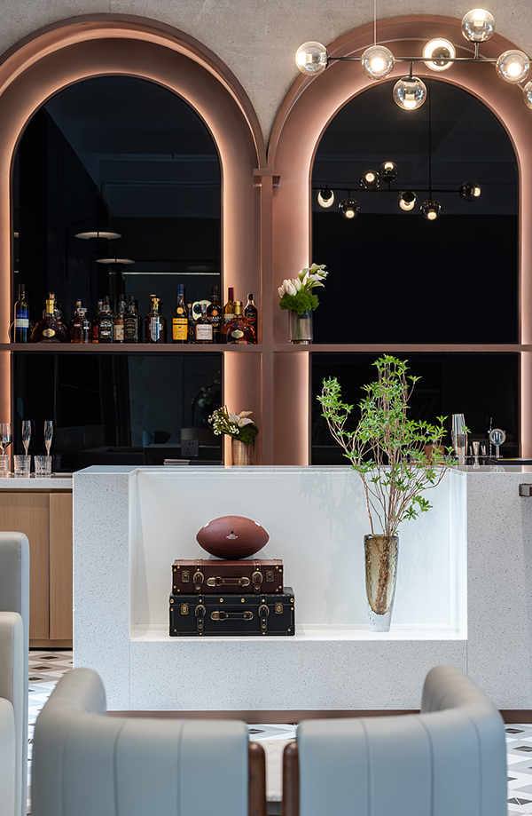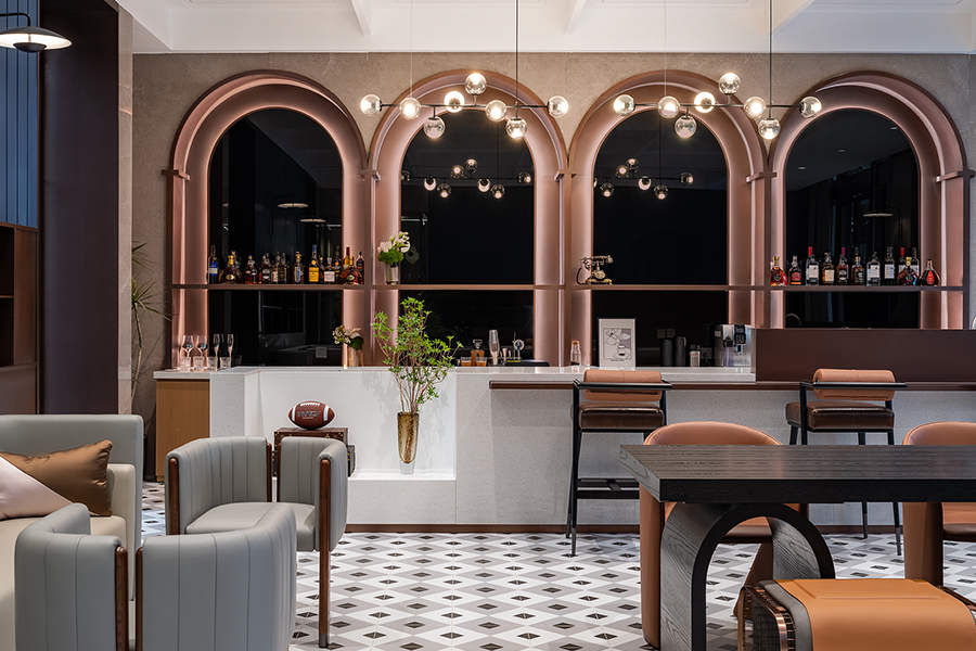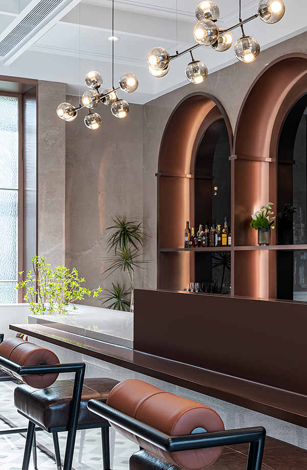 咖啡吧極具復(fù)古時(shí)尚,整體設(shè)計(jì)以城市留存的歷史建筑及裝飾語言為載體,以當(dāng)代的設(shè)計(jì)語言詮釋古典傳統(tǒng),結(jié)合幾何線條和拱形元素,讓空間成為一個(gè)雅致、隨性、藝術(shù)的生活居所。
