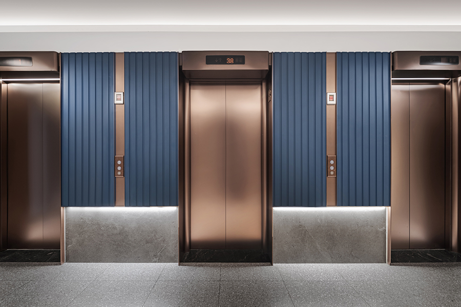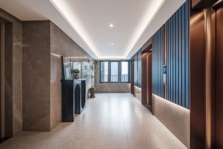 電梯間延續(xù)大堂設(shè)計(jì)風(fēng)格,色彩上深淺的碰撞,金屬色的介入,讓整個(gè)空間呈現(xiàn)出現(xiàn)代時(shí)尚又極致簡約的格調(diào)。