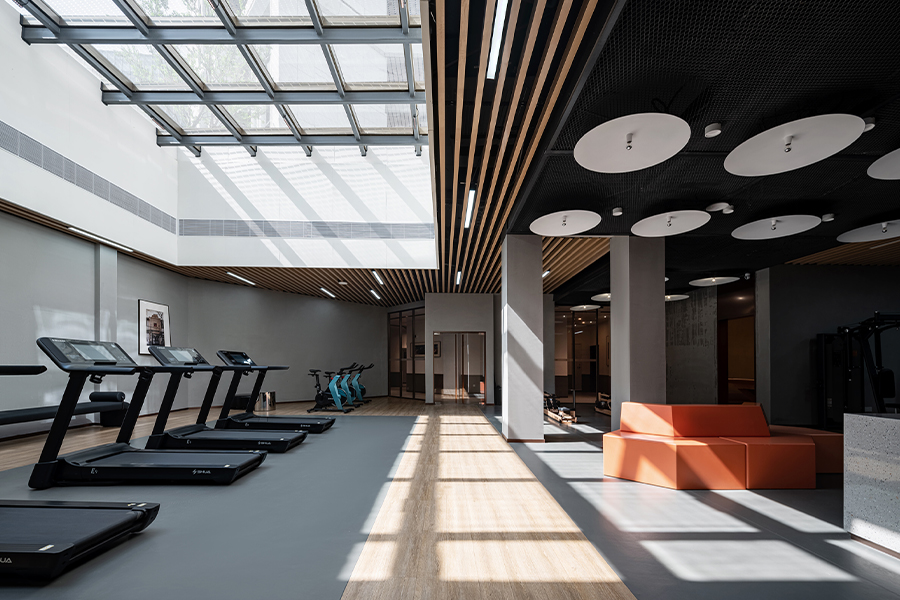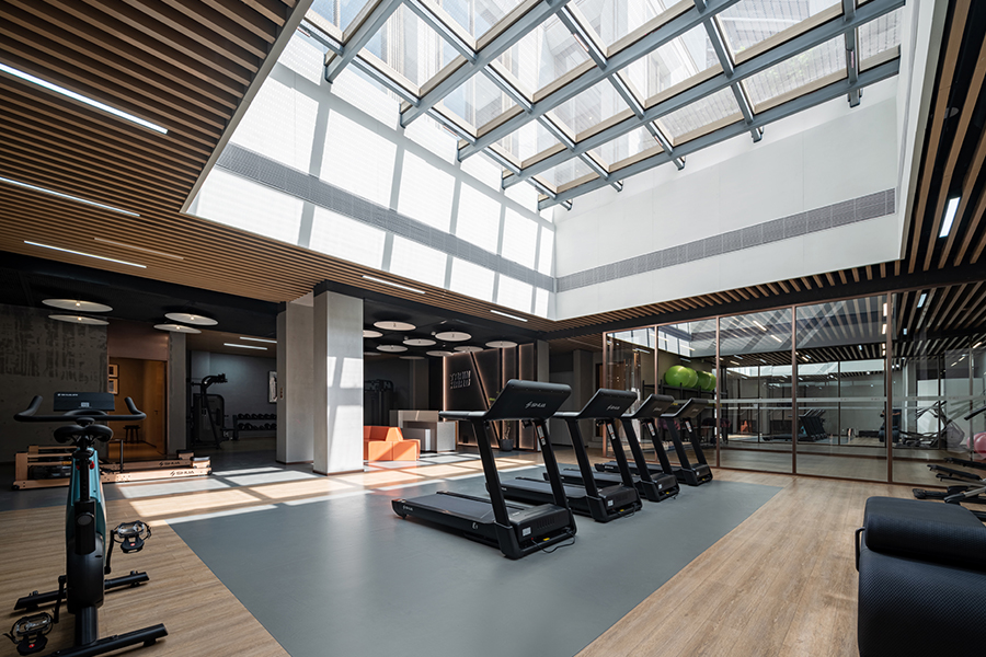 健身房及娛樂空間以輕工業(yè)風(fēng)格表現(xiàn),通過采光天井格柵的自然光照射變化,更直接體現(xiàn)辰光的變化。肌理感的材質(zhì)與海派文化窗格,營造室內(nèi)高級(jí)藝術(shù)感。