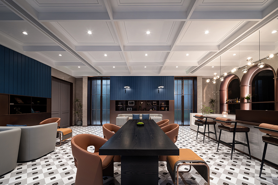 以上海的“摩登時(shí)尚”為設(shè)計(jì)背景,設(shè)計(jì)團(tuán)隊(duì)通過推敲人與自然的關(guān)系,將城市肌理融入設(shè)計(jì),讓穿行在空間的人解碼魔都的不同場(chǎng)景。井格式天花吊頂呈現(xiàn)出雕刻般的立體感,層次分明。幾何菱形地磚彰顯空間的現(xiàn)代復(fù)古感。