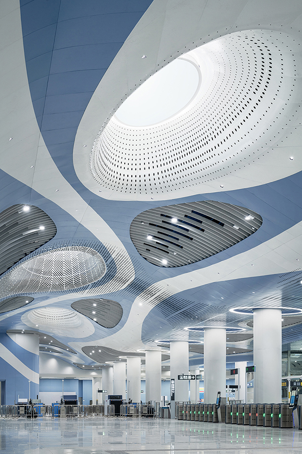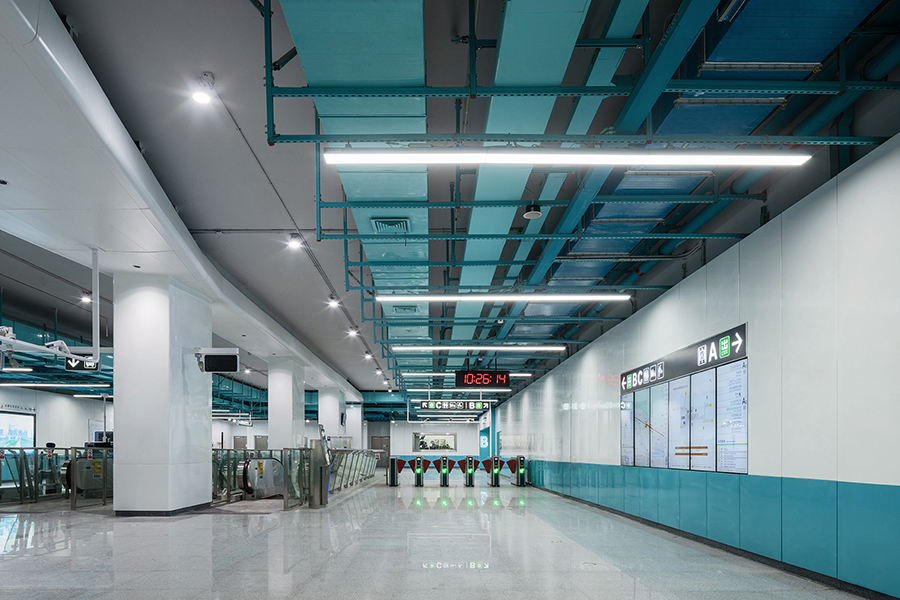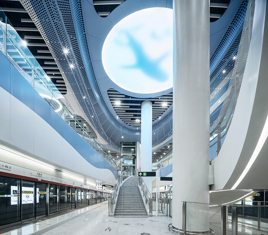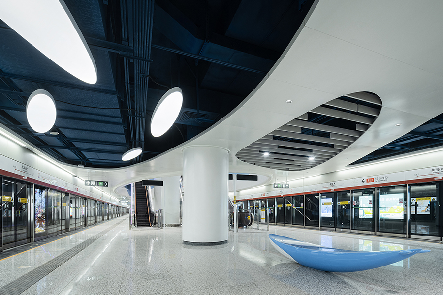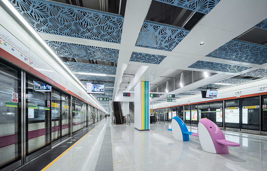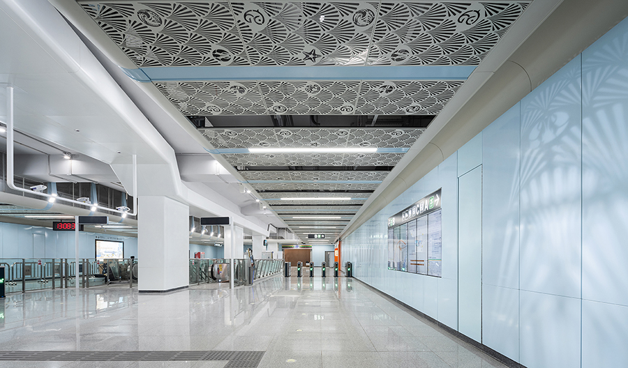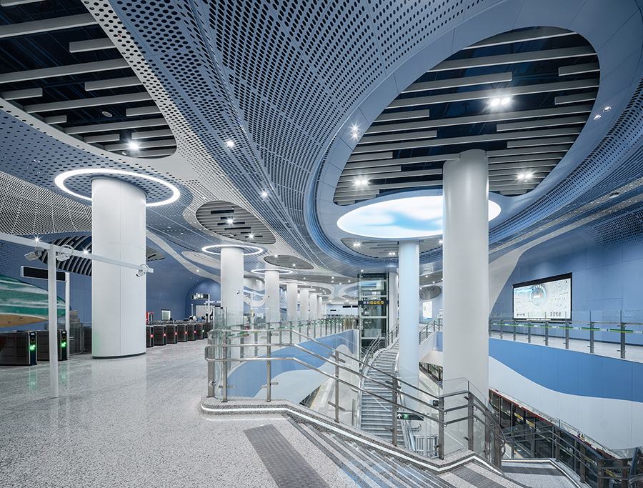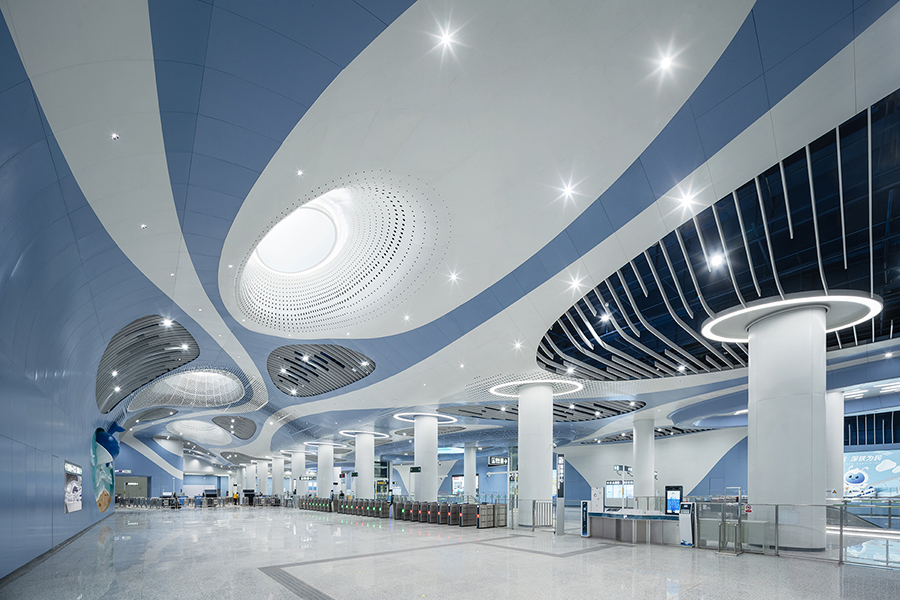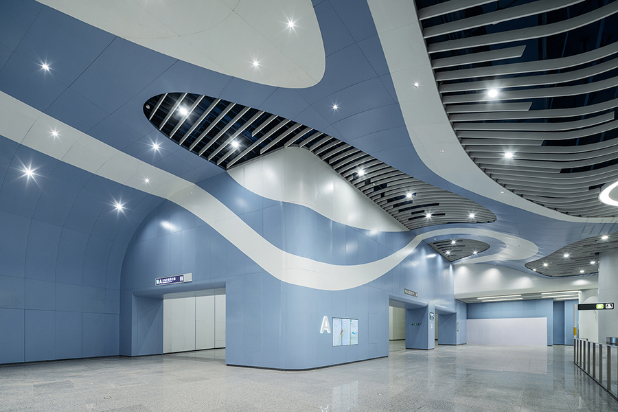 車站兩側天花結合海洋生物造型元素與色彩,結合鏤空剪影設計,燈光投射在墻面上,創造出如同陽光灑落海面的虛實光影效果。