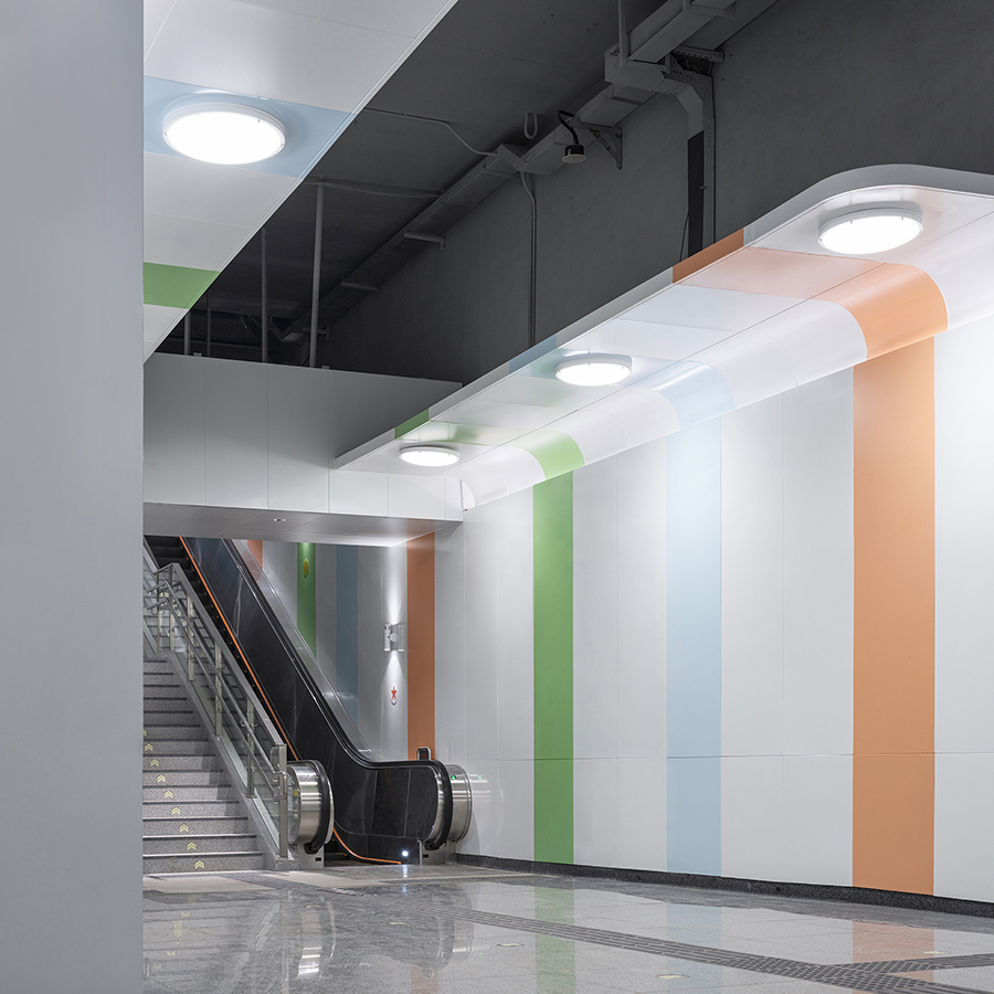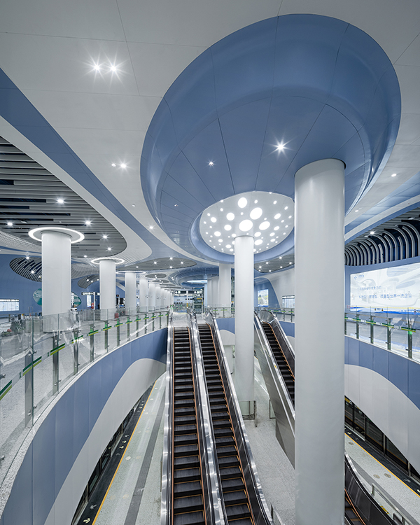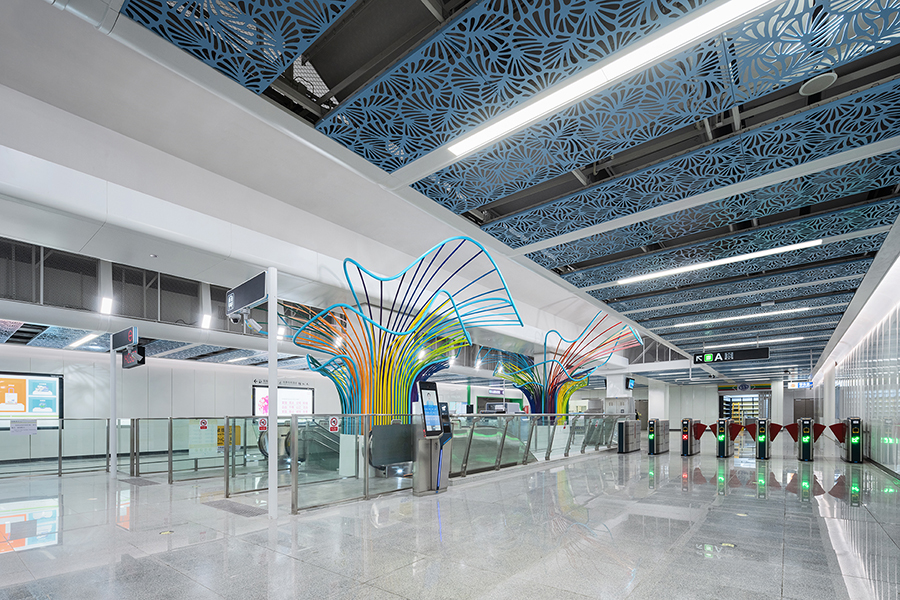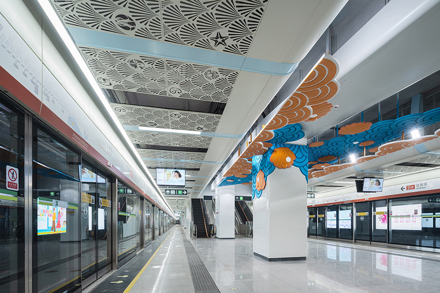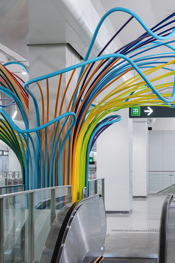 車站兩側天花結合海洋生物的造型元素與色彩,樓扶梯中央七彩珊瑚形態藝術造型柱成為車站的視覺焦點。